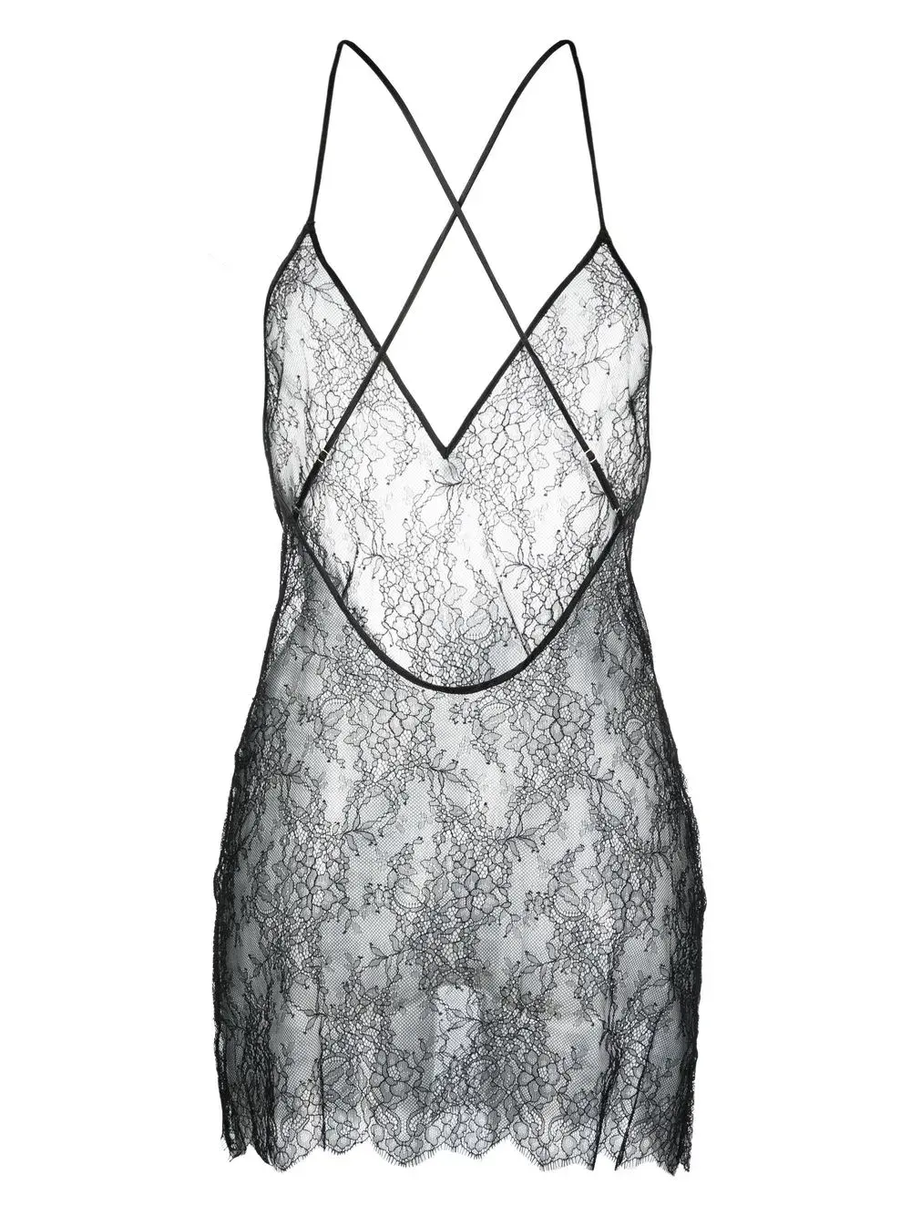 Черный, прозрачное покрытие, вставки из цветочного кружева, вырез в форме сердца, перекрестные бретели на спине, открытая спина, без рукавов и подол с фестонами.