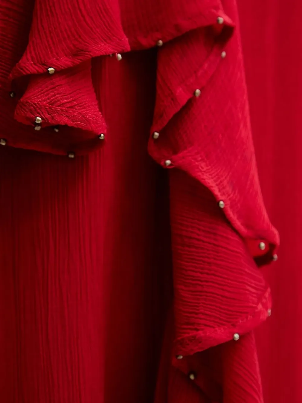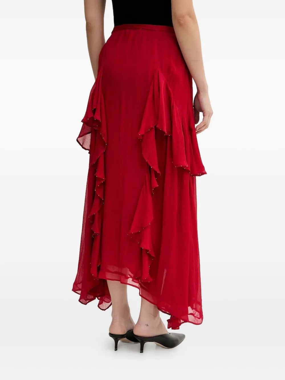 Красные многоярусные оборки, асимметричный подол, украшение заклепками, длина миди