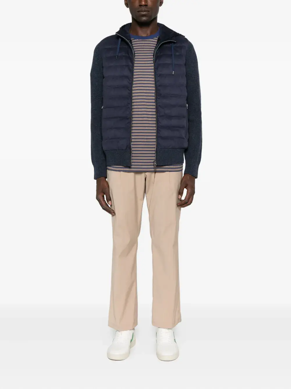 Темно-синий стеганый дизайн, капюшон, застежка-молния, ребристый подол, трикотажные рукава