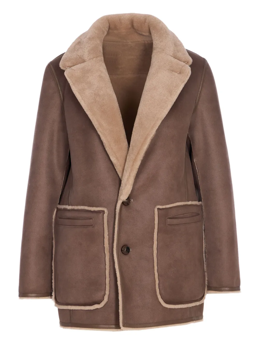 Бежевый искусственный мех, застежка на пуговицы, накладные карманы, двусторонний дизайн, воротник-стойка с зазубринами.
