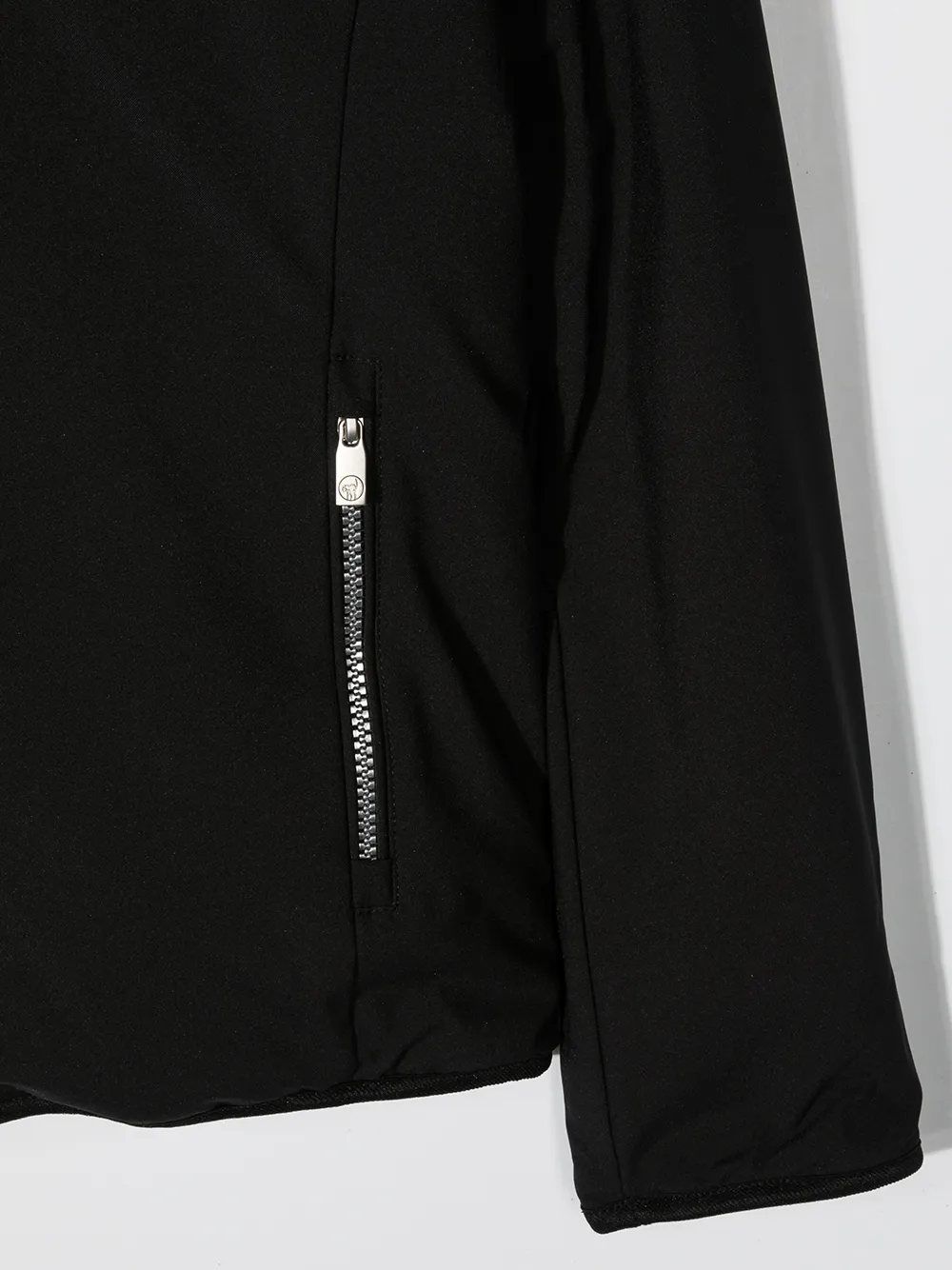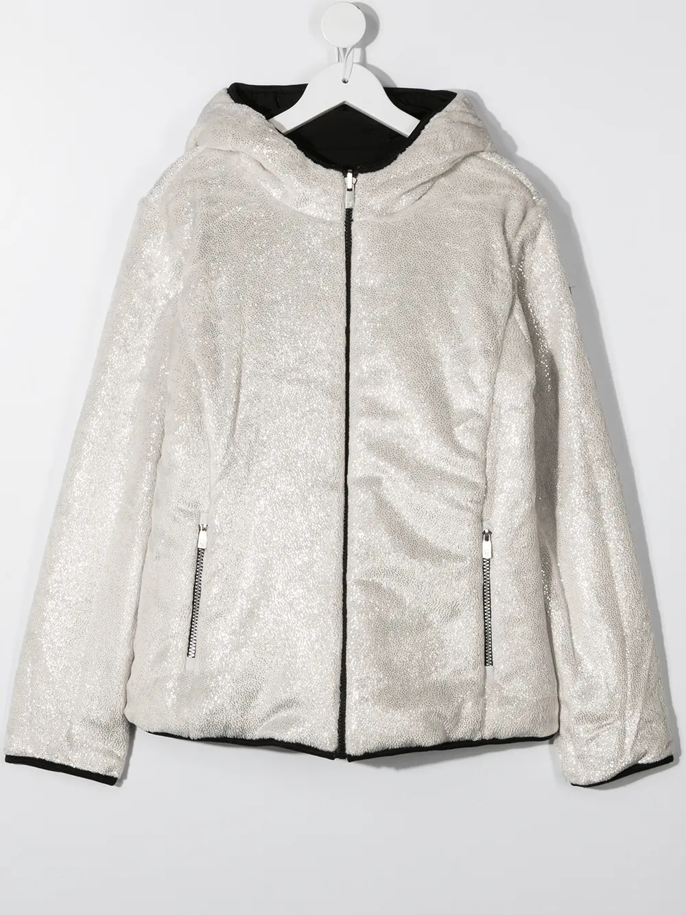 Двухсторонний дизайн, классический капюшон, застежка на молнии спереди, длинные рукава и передние карманы на молнии.