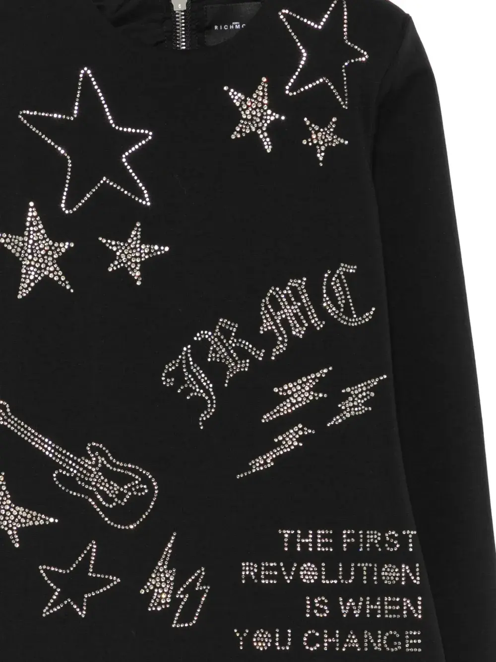 Черная кофточка с длинными рукавами, круглым вырезом, застежкой-молнией сзади, отделкой стразами.
