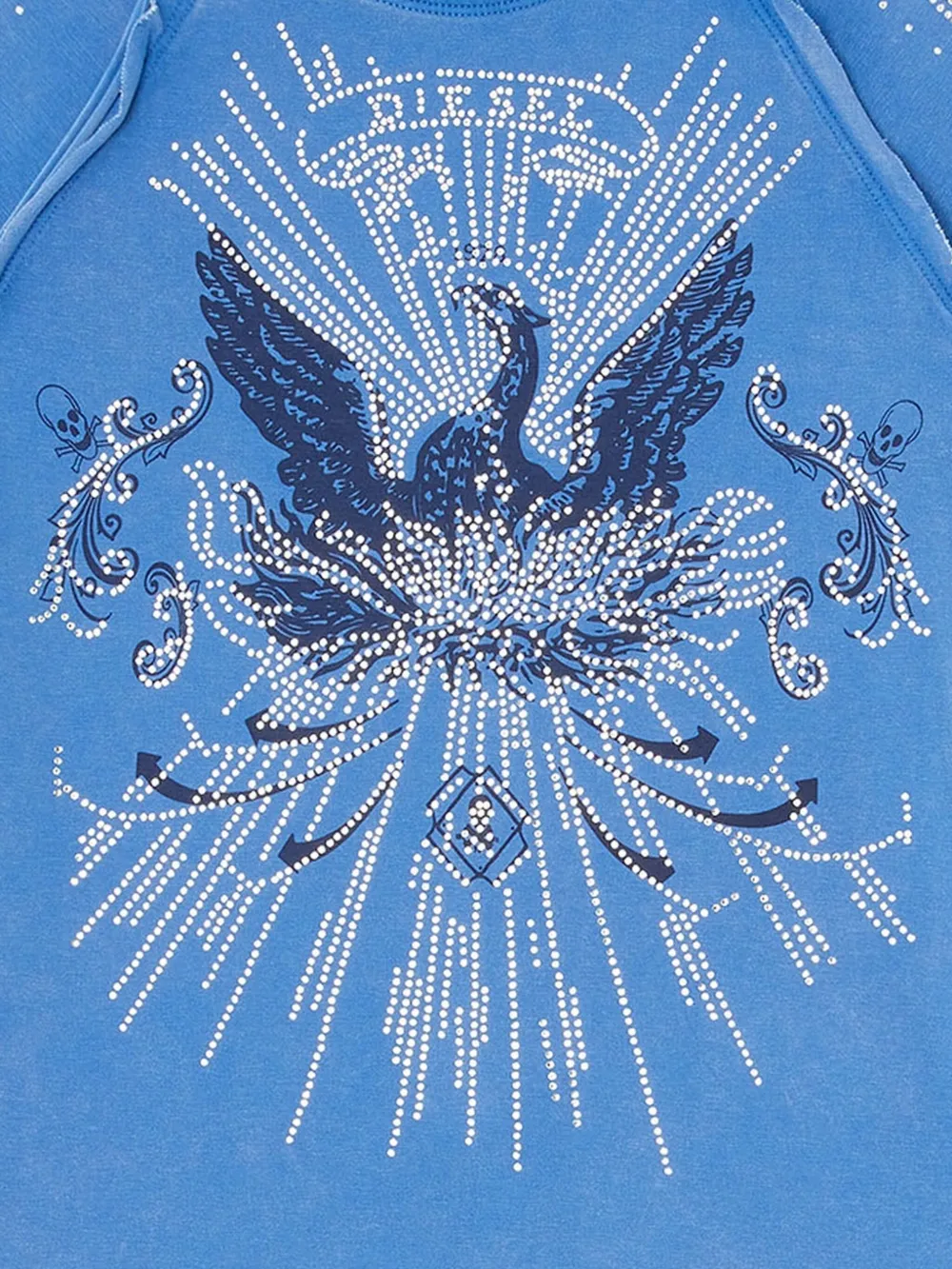Синий феникс и черепа, графические украшения из стразов, рукава реглан, круглый вырез.