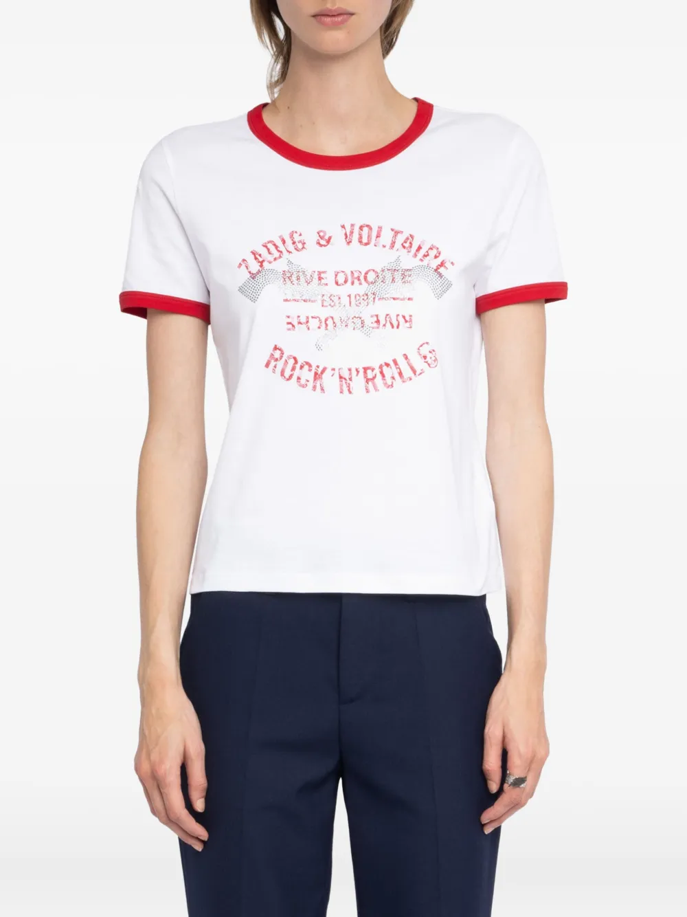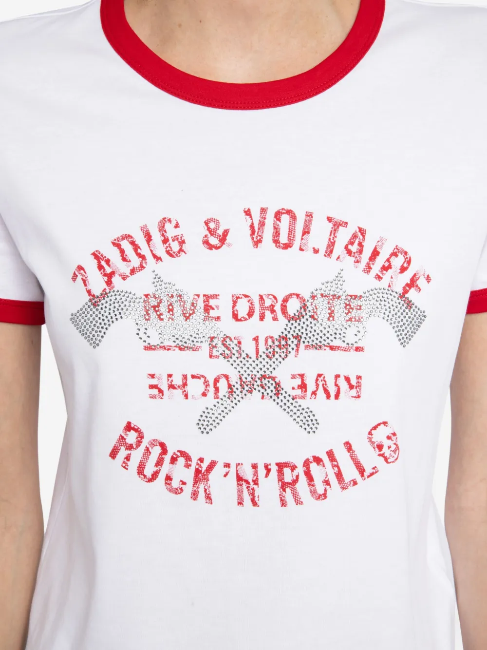 Бело-красная отделка стразами, графический принт, короткие рукава, круглый вырез горловины
