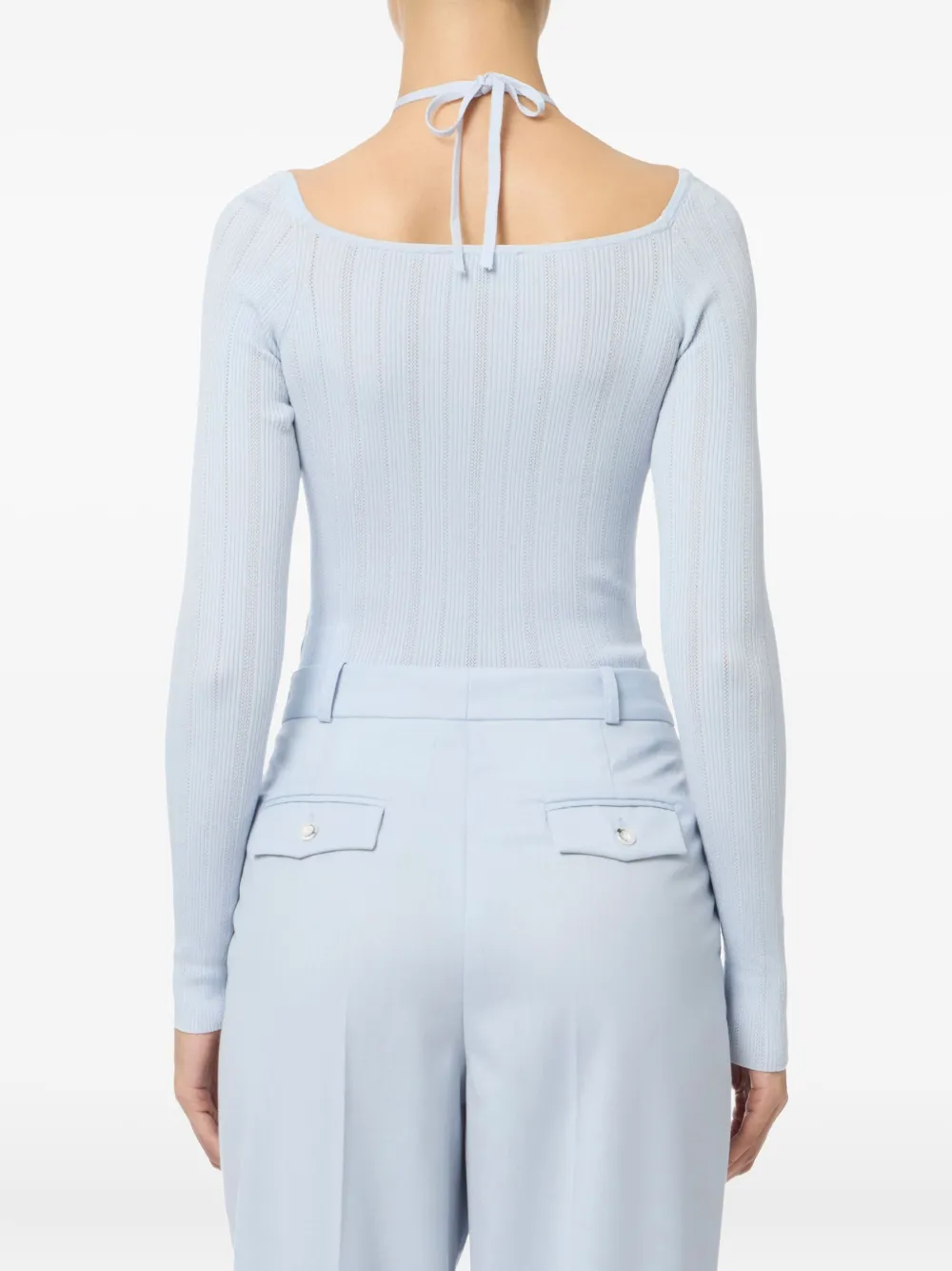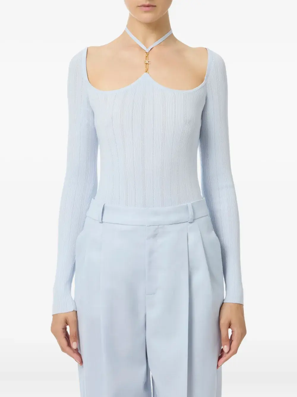 Синяя ребристая трикотажная ткань, квадратный вырез, длинные рукава, золотистая застежка