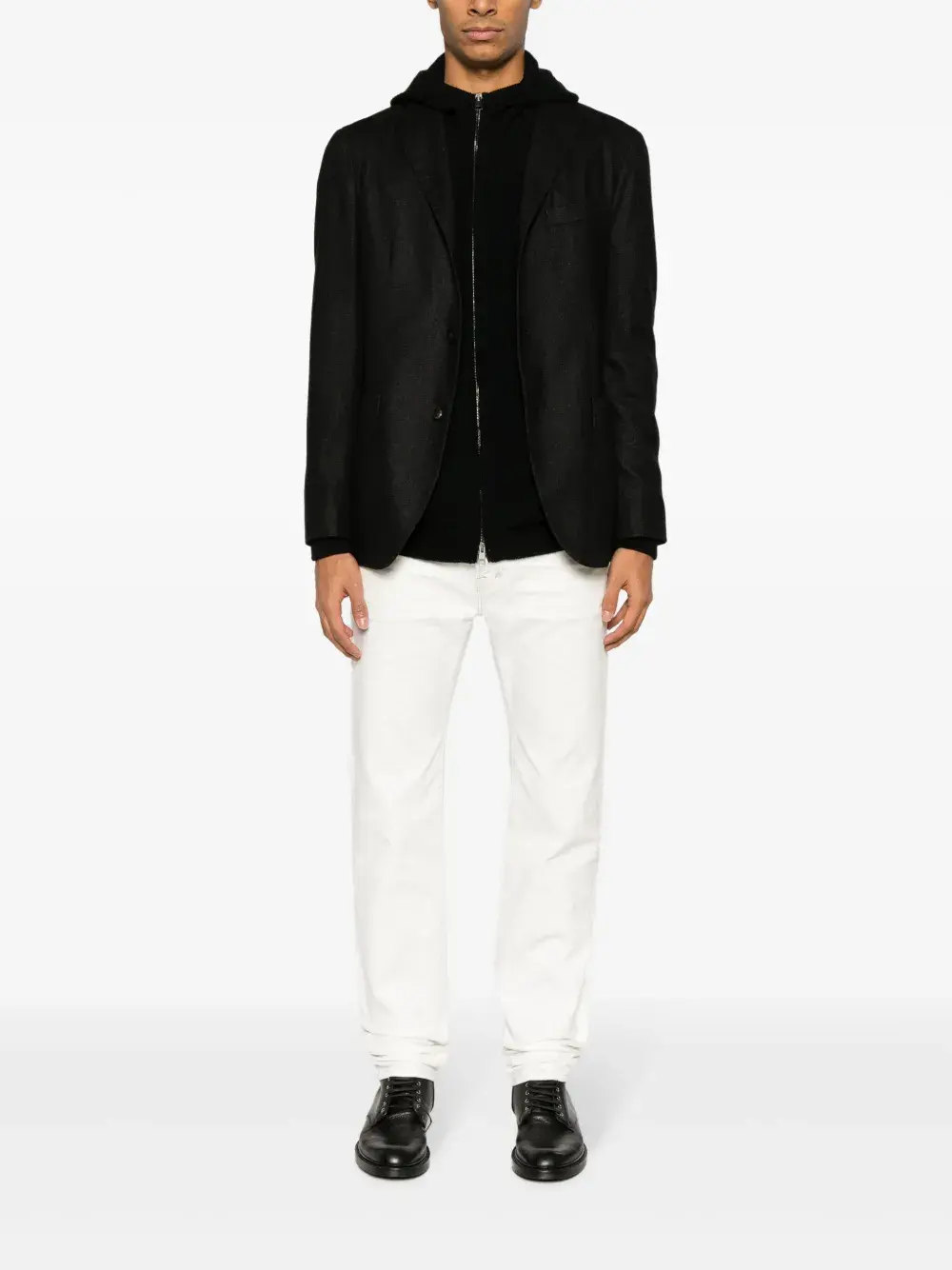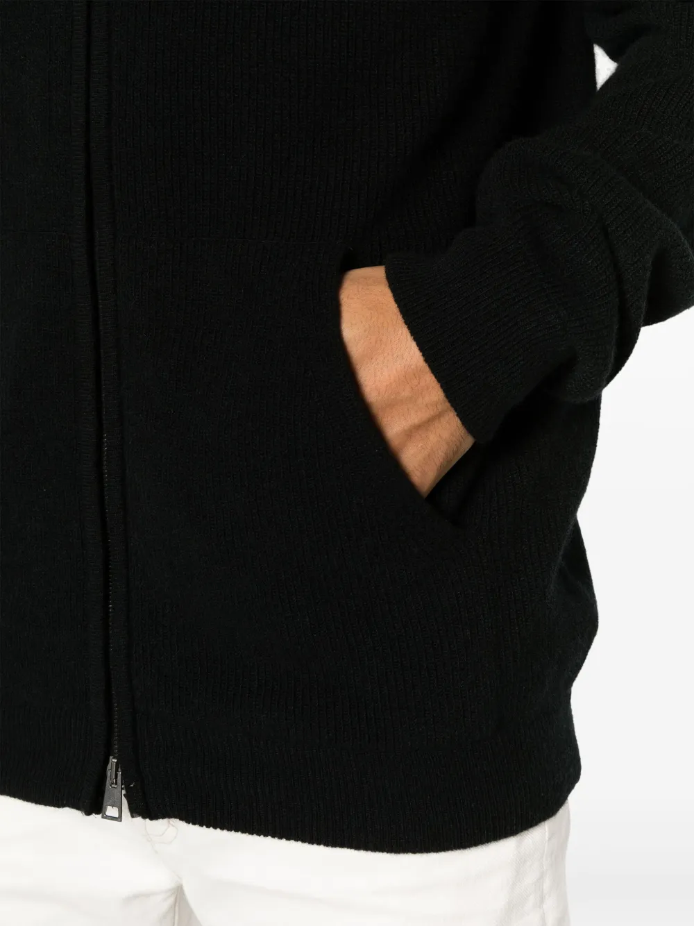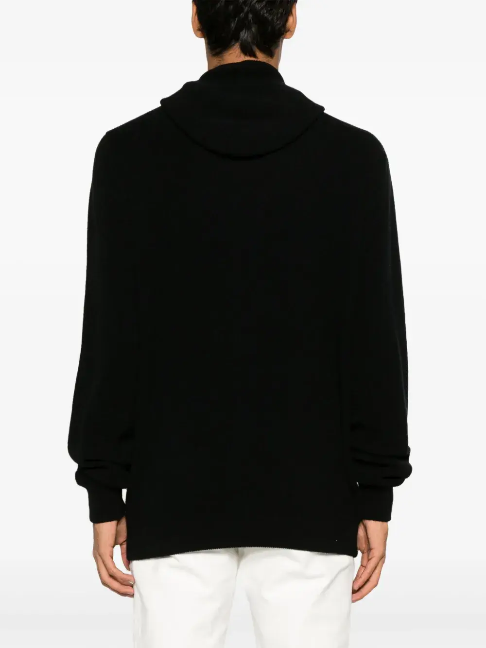 Черный, шерсть мериноса, ткань в мелкий рубчик, классический капюшон, высокий воротник, длинные рукава, застежка на молнии спереди, два вшитых кармана по бокам и прямой подол.