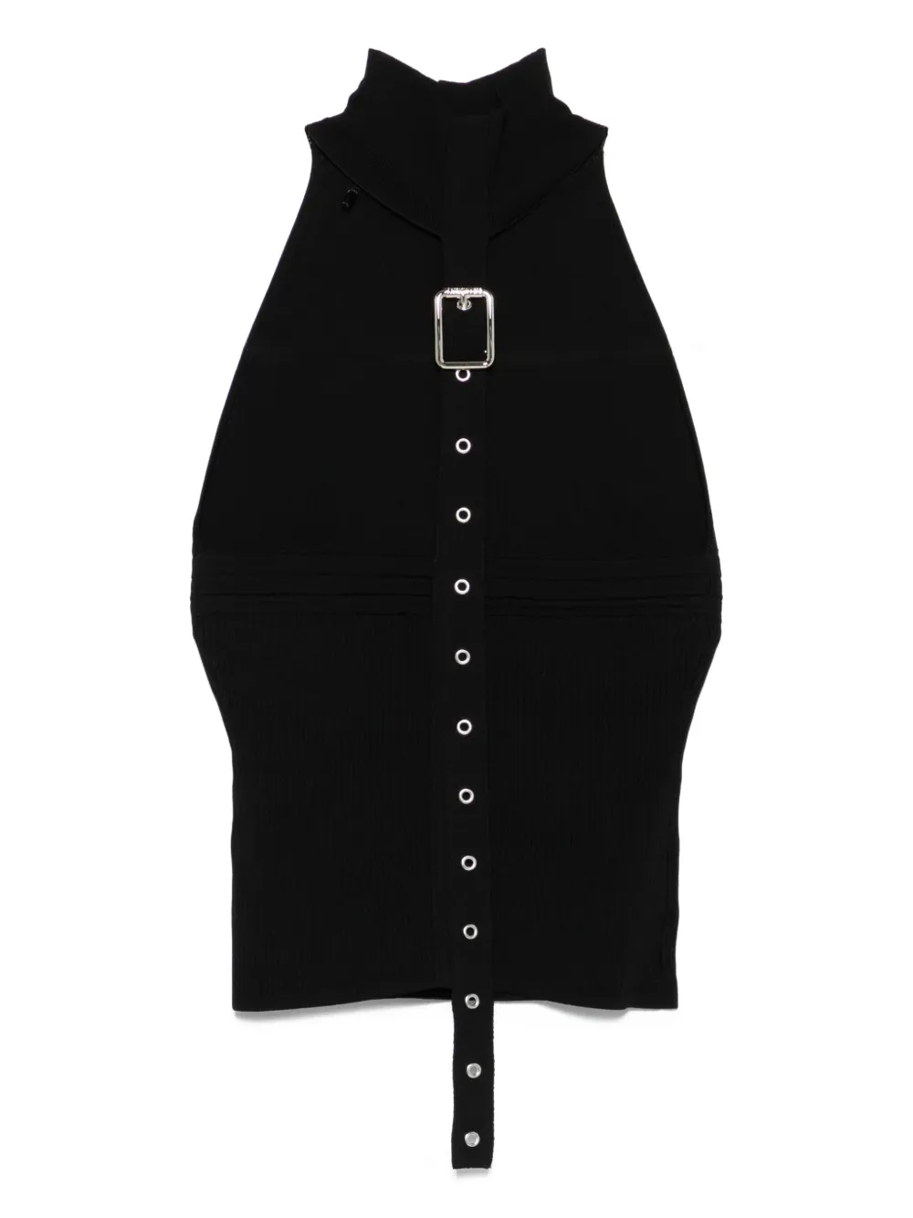 Черная водолазка с ребристым тиснением, без рукавов, застежка на пряжку.