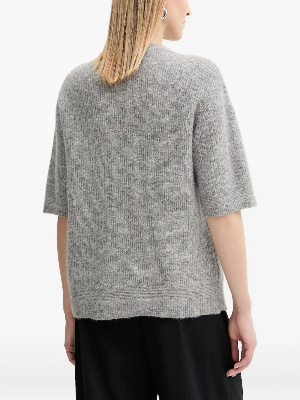 Серая ребристая фактура, короткие рукава, круглый вырез, застежка на пуговицы.