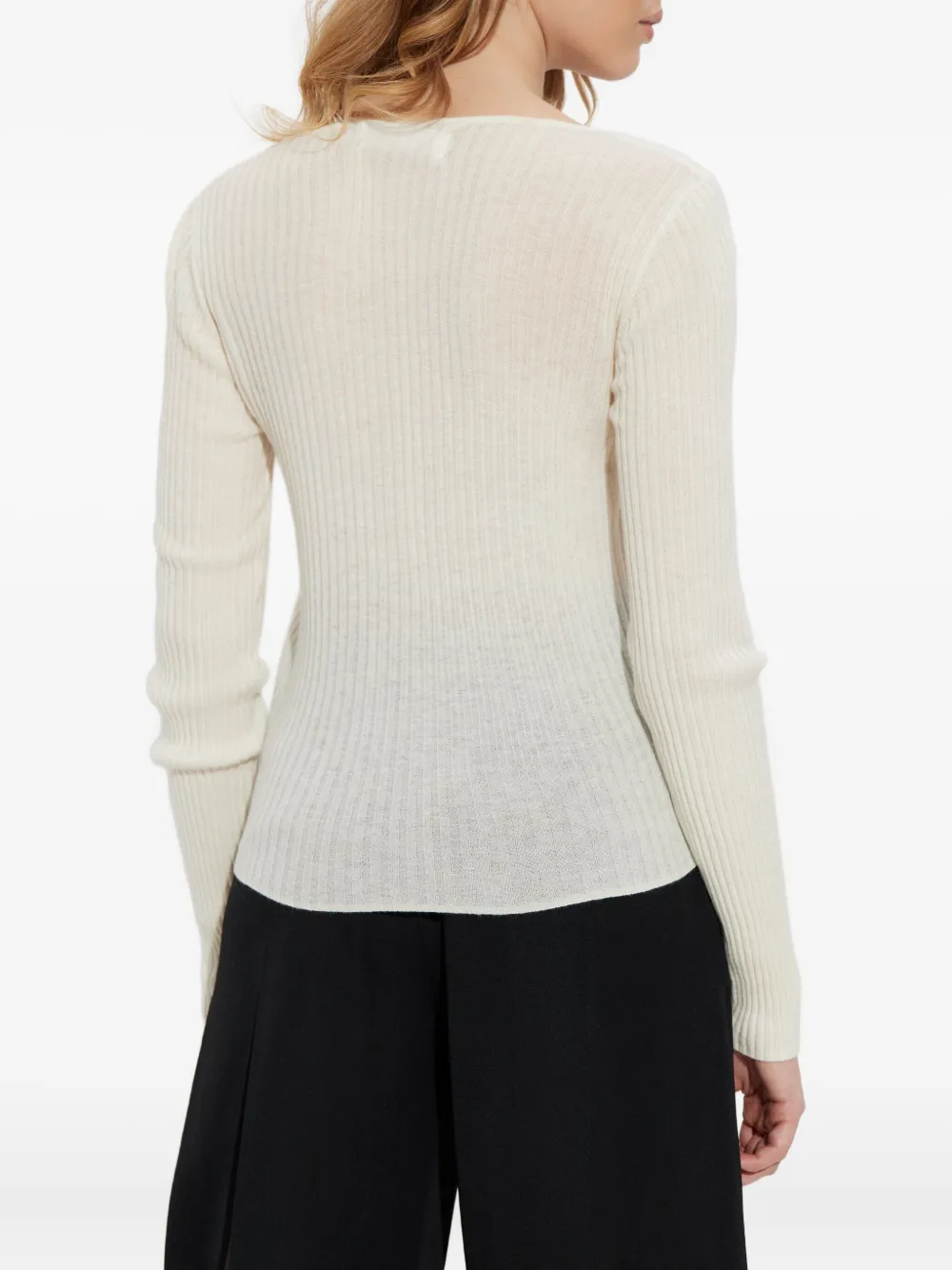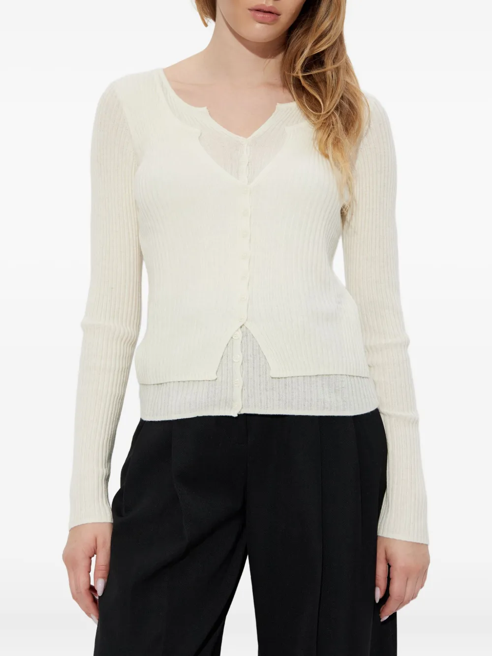 Ребристая текстура кремового цвета, застежка спереди, V-образный вырез, длинные рукава.