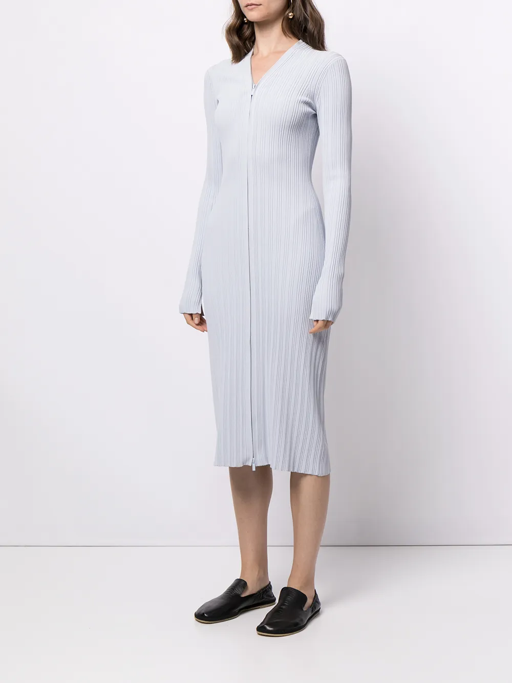 Трикотаж в рубчик, V-образный вырез, застежка на молнии спереди, длинные рукава, длина миди и эластичная модель.