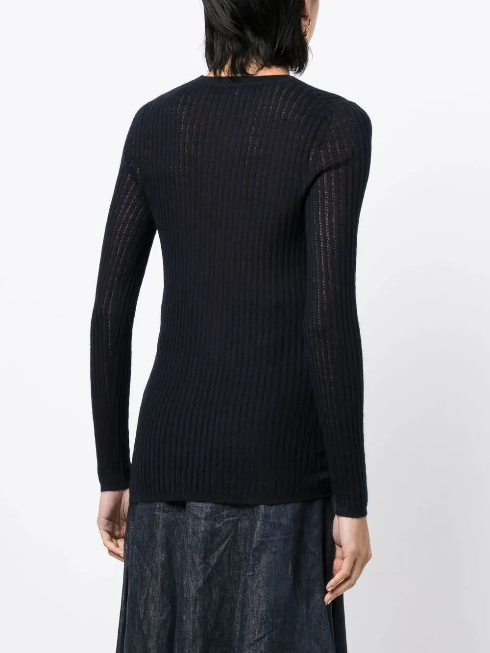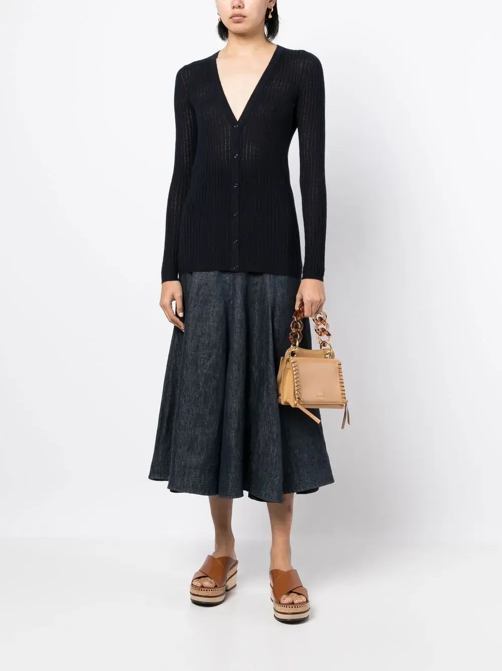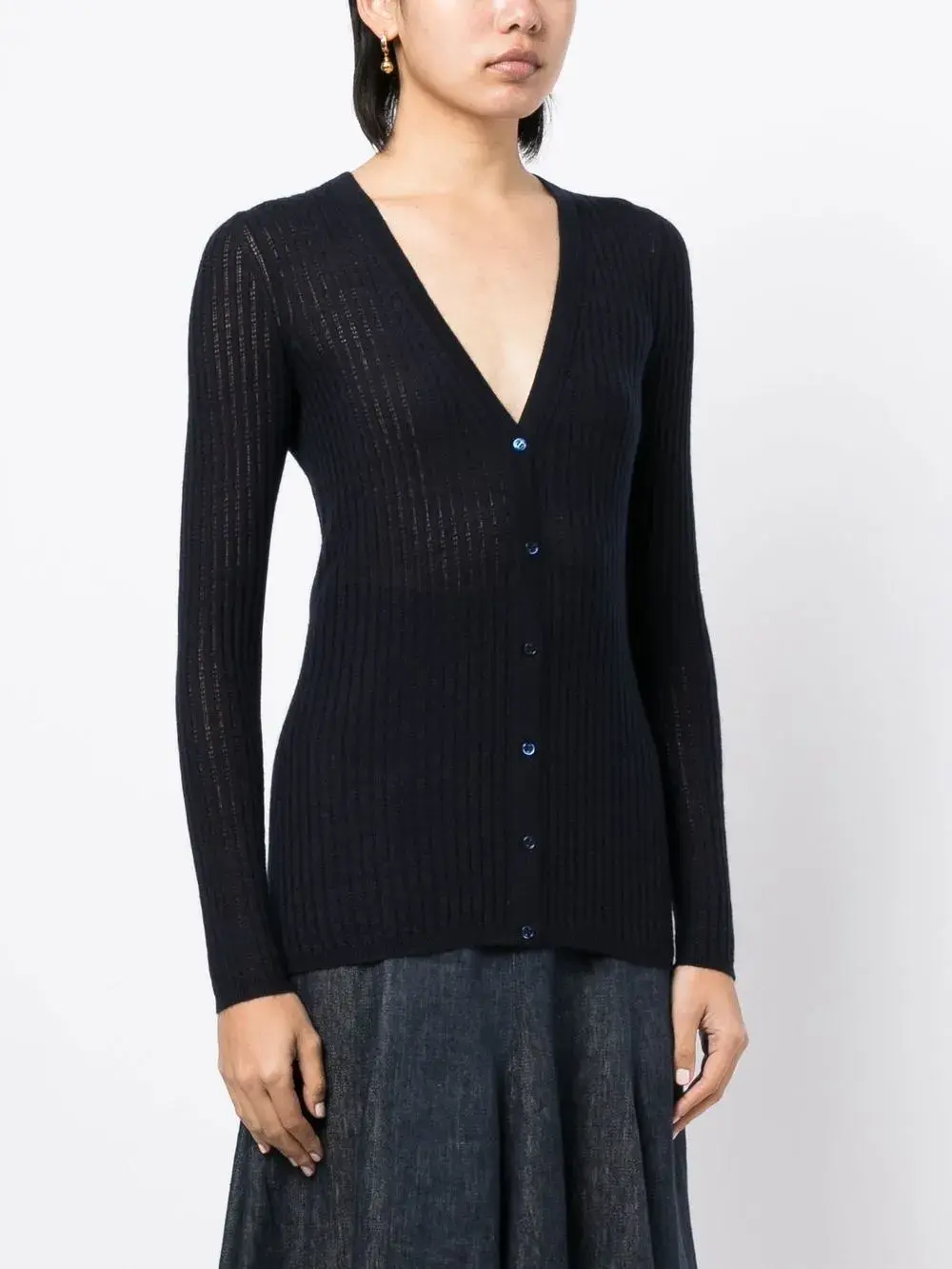 Темно-синий, смесь кашемира и шелка, трикотаж в рубчик, V-образный вырез, застежка на пуговицах спереди, длинные рукава и прямой подол.