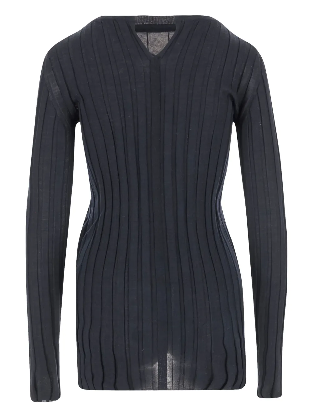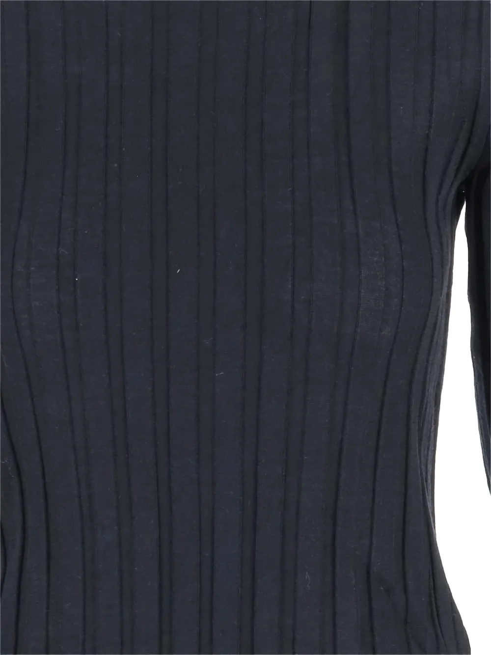 Темно-синяя ребристая фактура, круглый вырез горловины, длинные рукава, прямой подол.