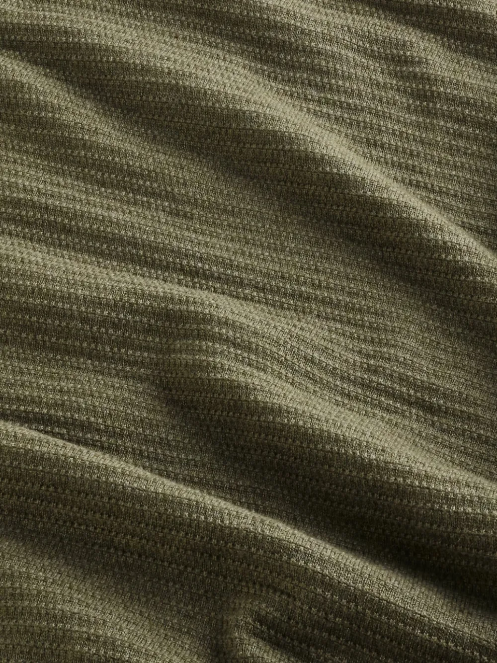 Оливково-зеленый, ребристая фактура, круглый вырез горловины, длинные рукава, прямой подол.