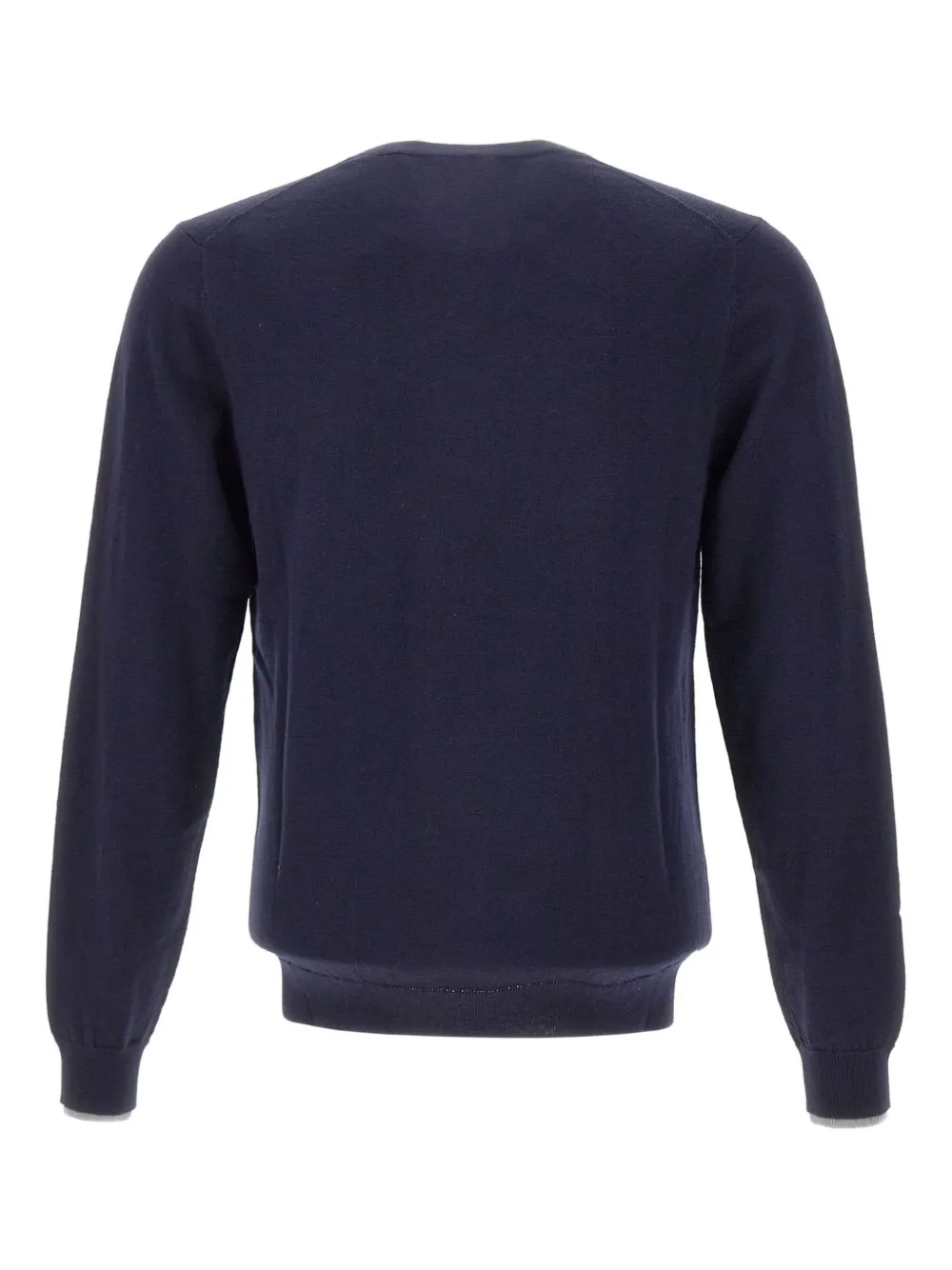 Темно-синяя шерстяно-хлопковая смесь, круглый вырез горловины, длинные рукава, ребристые манжеты.