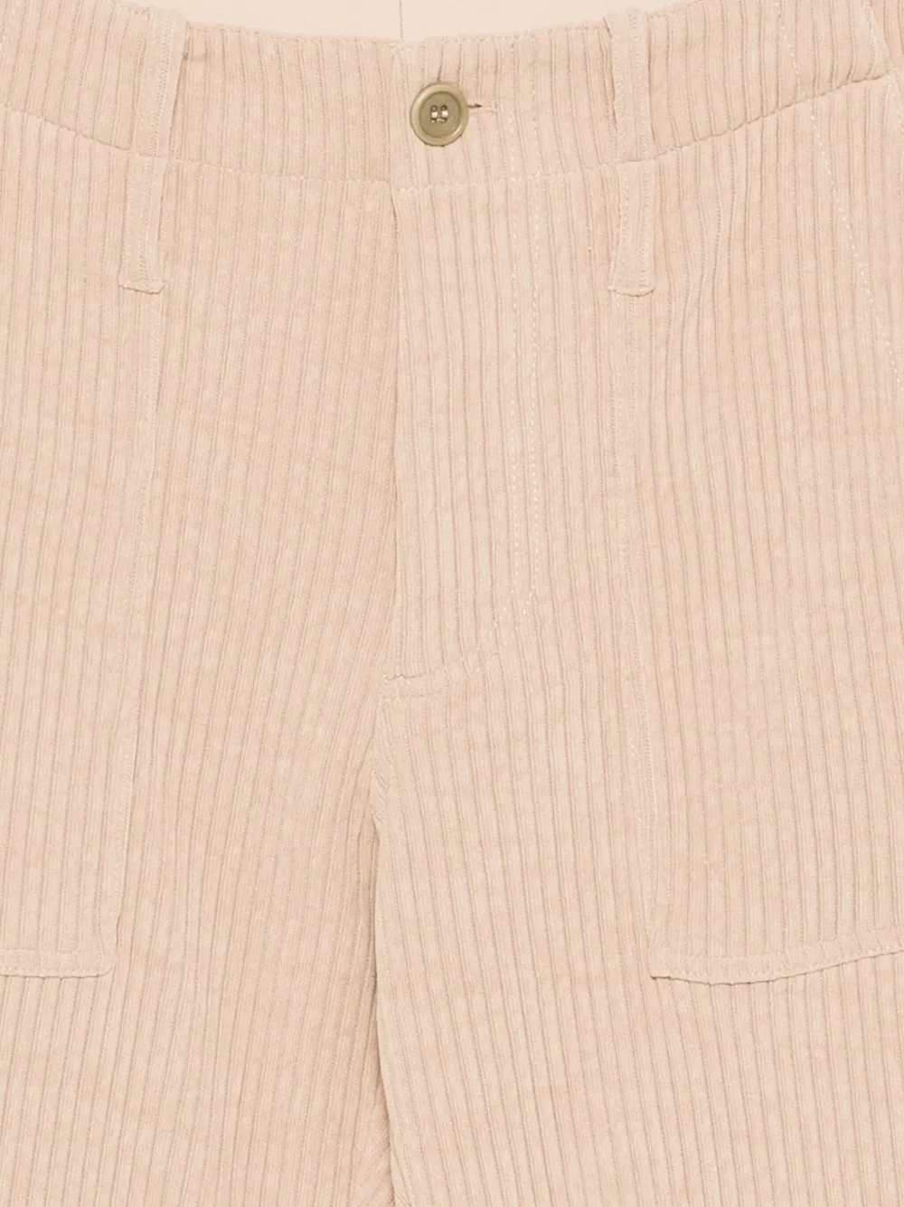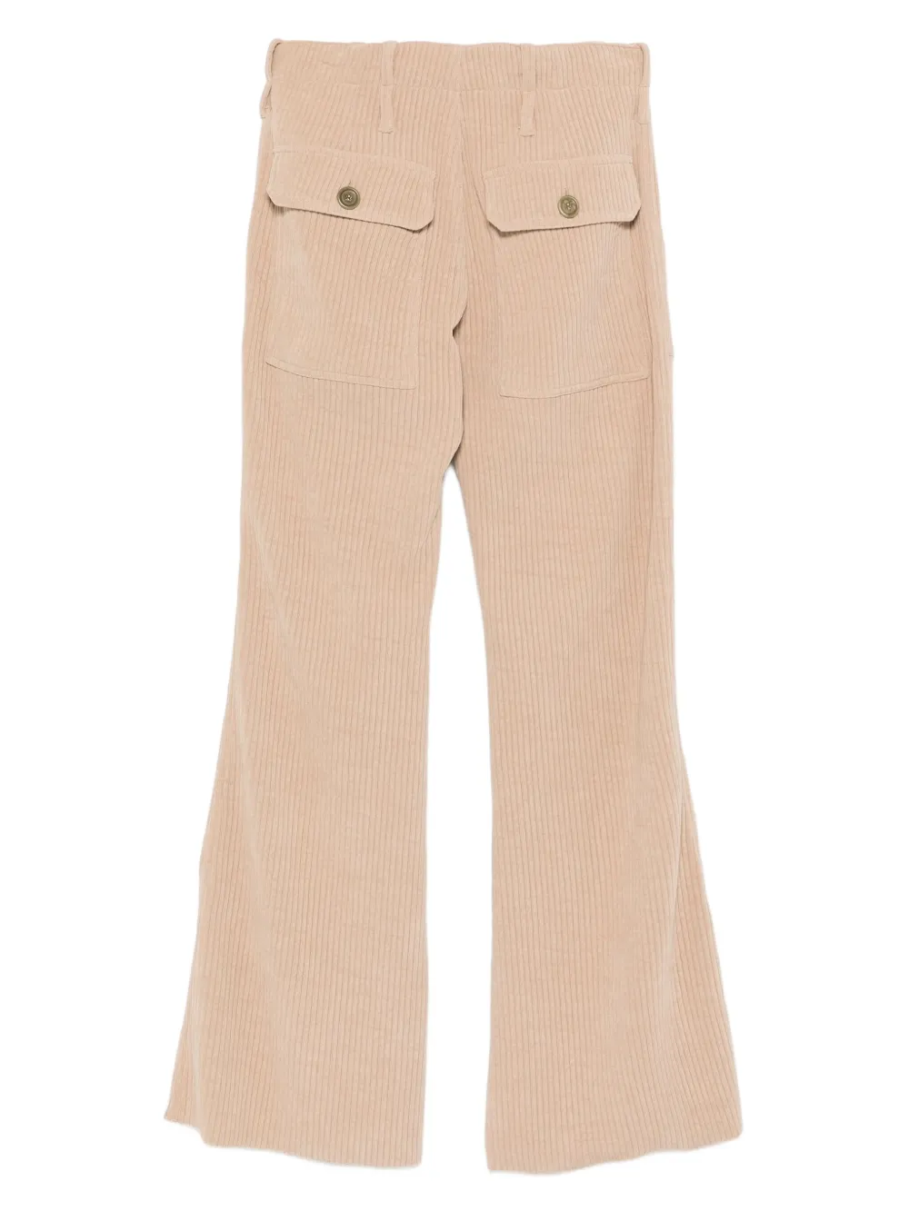 Бежевый ребристая текстура, застежка на пуговицы, накладные карманы, расклешенные брючины.