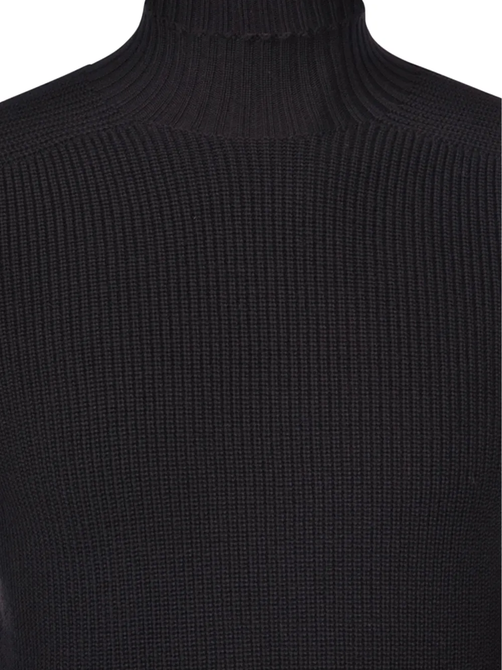 Черная шерстяная смесь с высоким воротом, ребристой текстурой, длинными рукавами.