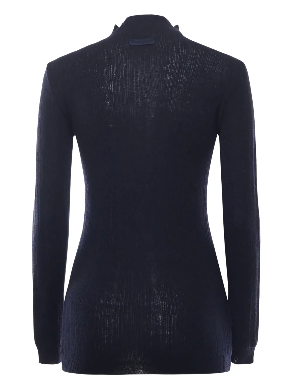 Темно-синяя ребристая фактура, высокий ворот, длинные рукава, прямой подол.