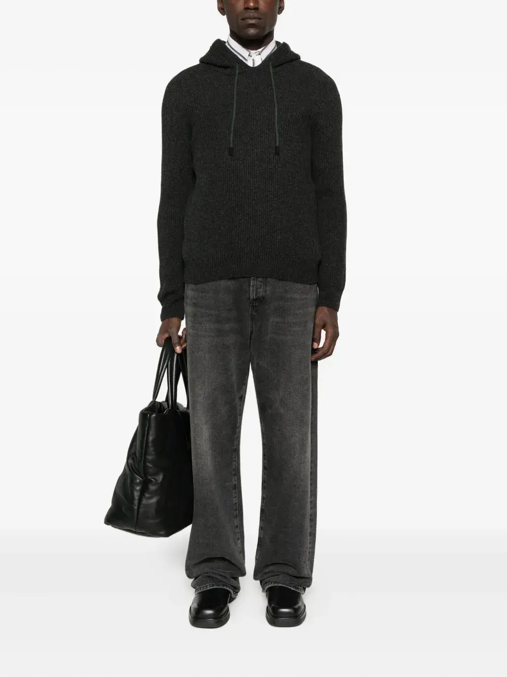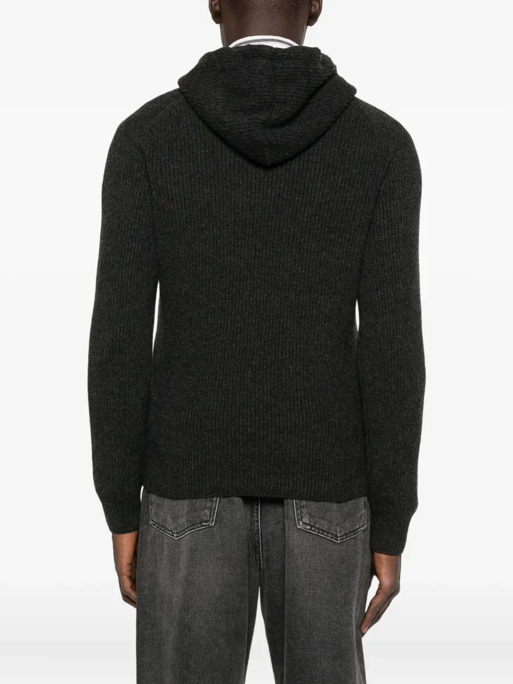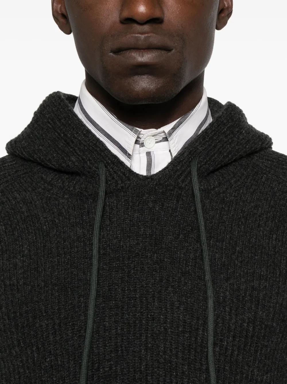Темно-серый ребристая вязка, капюшон, вырез горловины, длинные рукава, завязка на шнурке