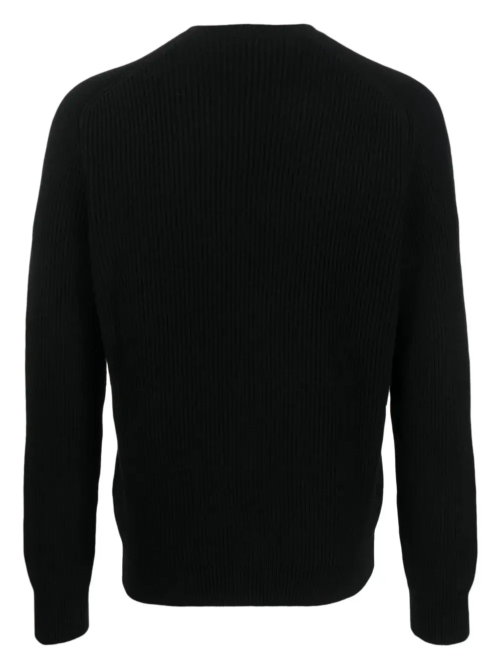 Черный, смесь шерсти и кашемира, трикотаж в рубчик, круглый вырез, длинные рукава и прямой подол.