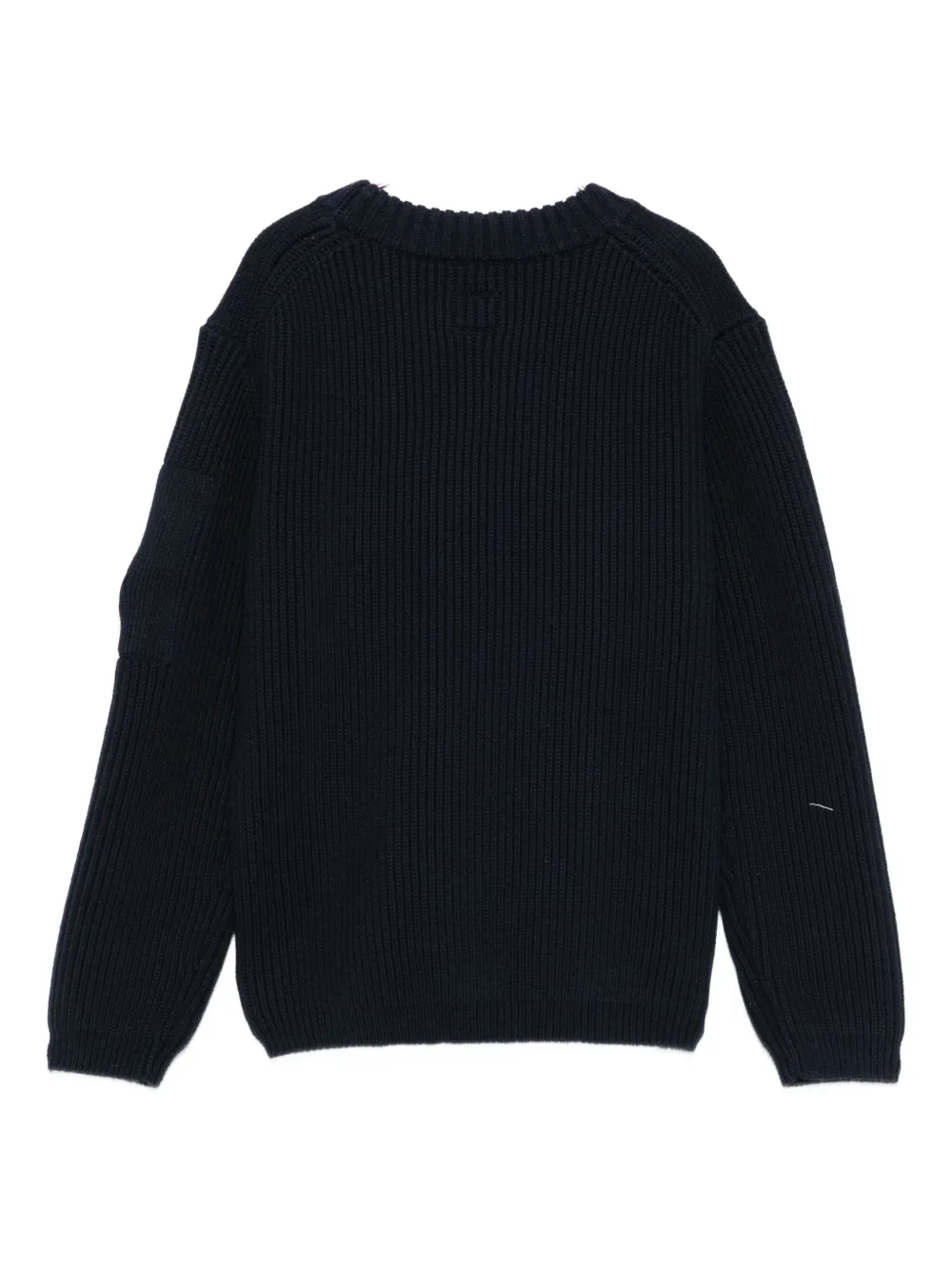 Темно-синий ребристая вязка, круглый вырез горловины, длинные рукава, карманы, нашивка на линзе. Компания CP Company рекомендует снимать все съемные аксессуары перед стиркой.