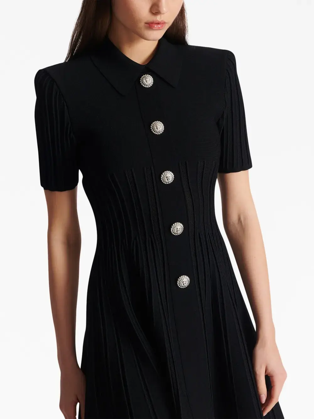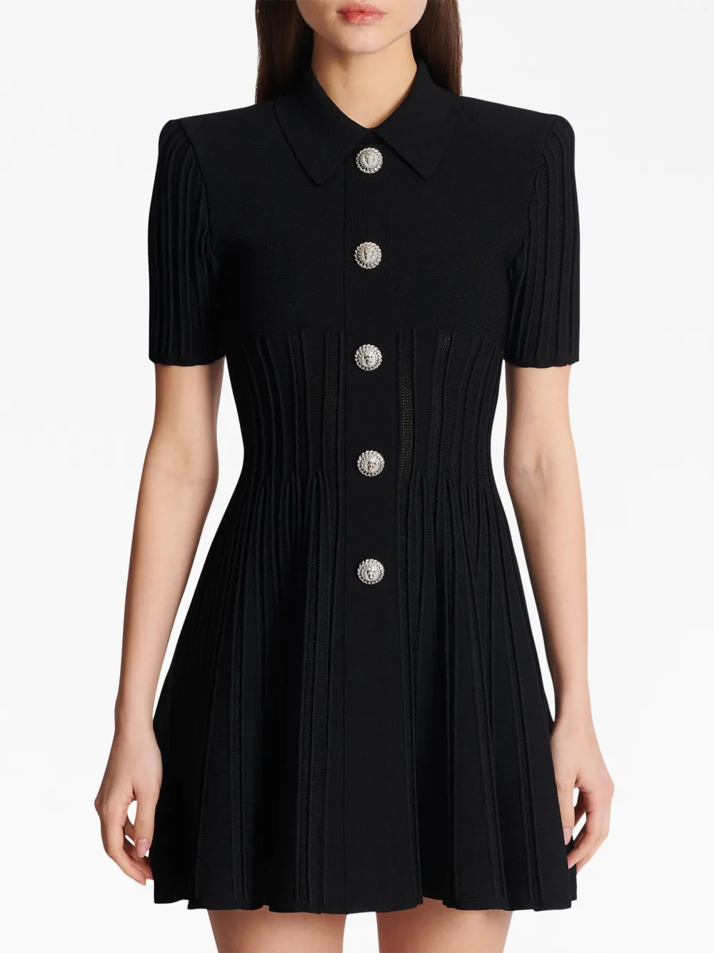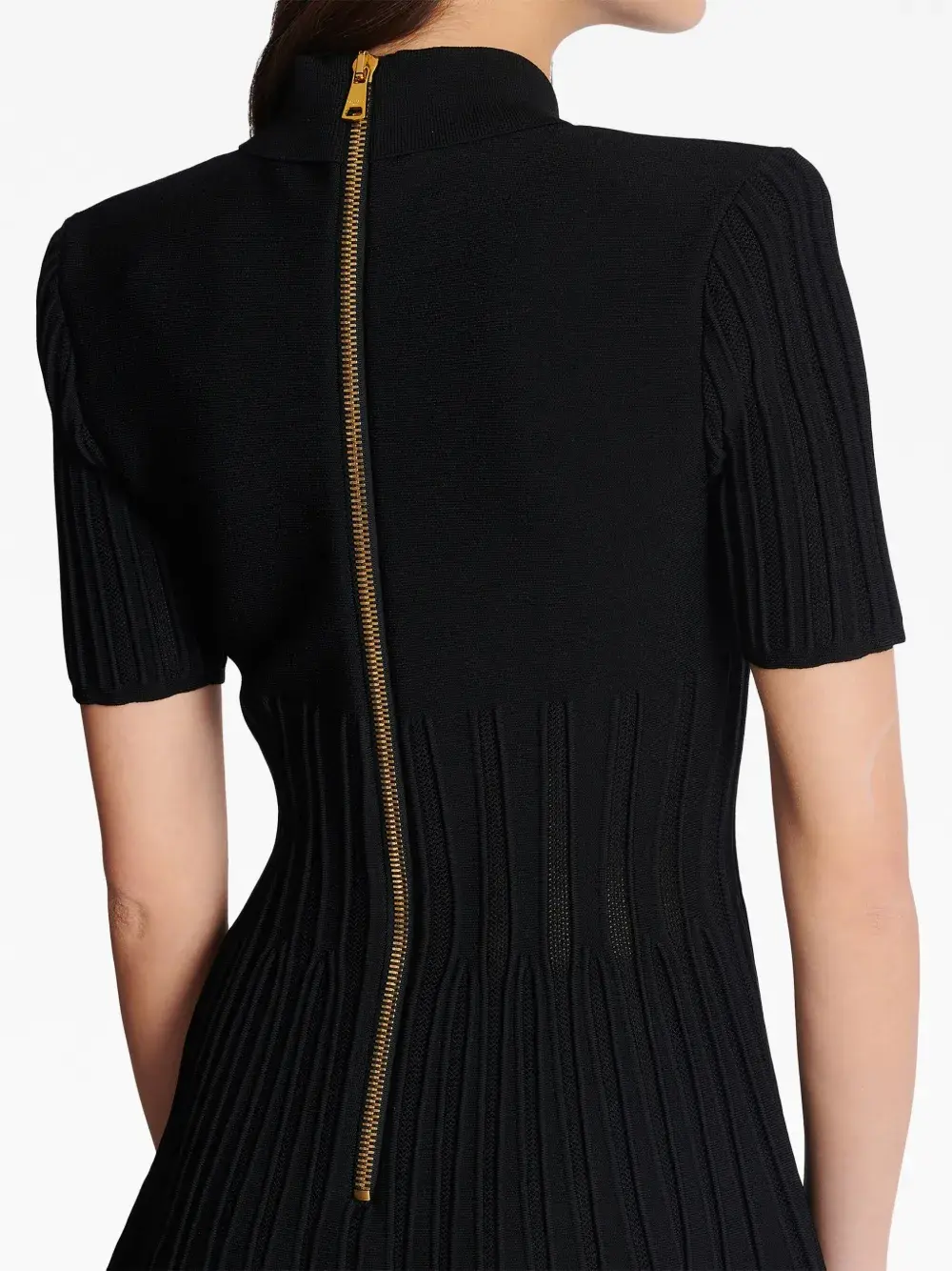 Черный, трикотаж в рубчик, классический воротник, застежка на пуговицах спереди, короткие рукава, застежка на молнии сзади, расклешенный подол и длина до бедер.