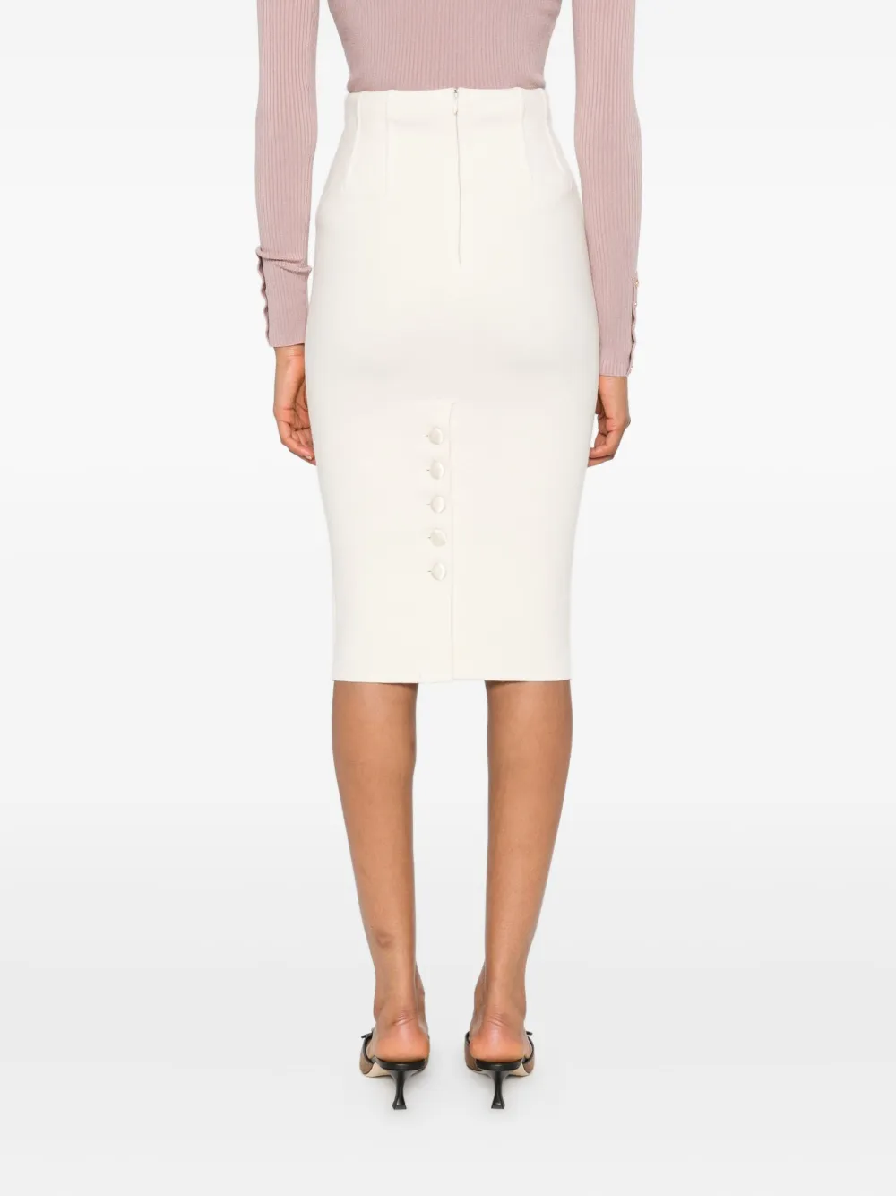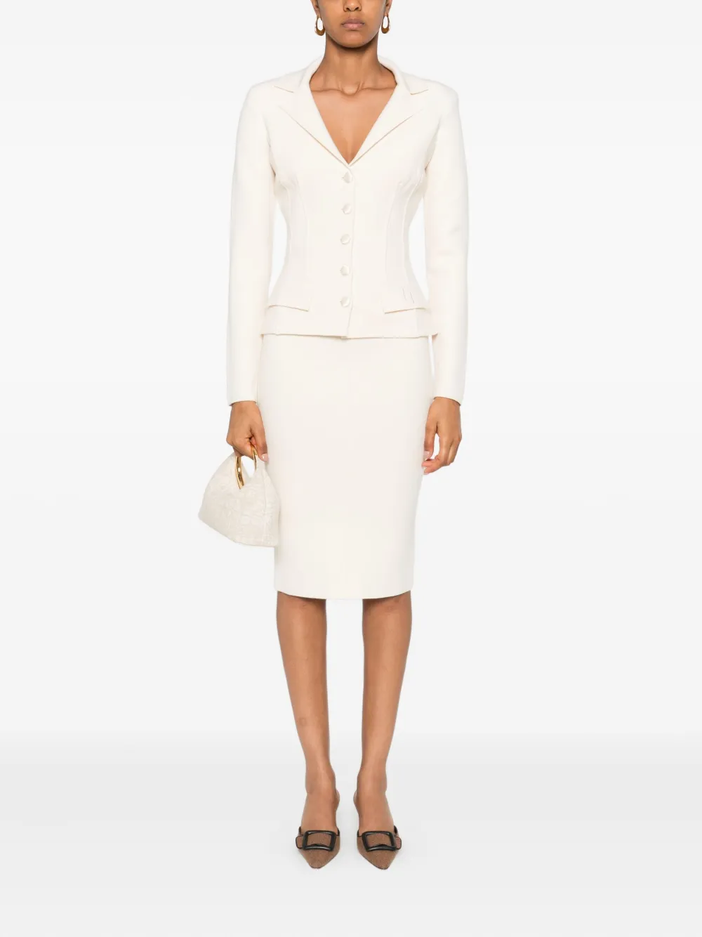Белоснежный, ребристая фактура, фасон «карандаш», высокая талия, приталенный силуэт, прямой подол