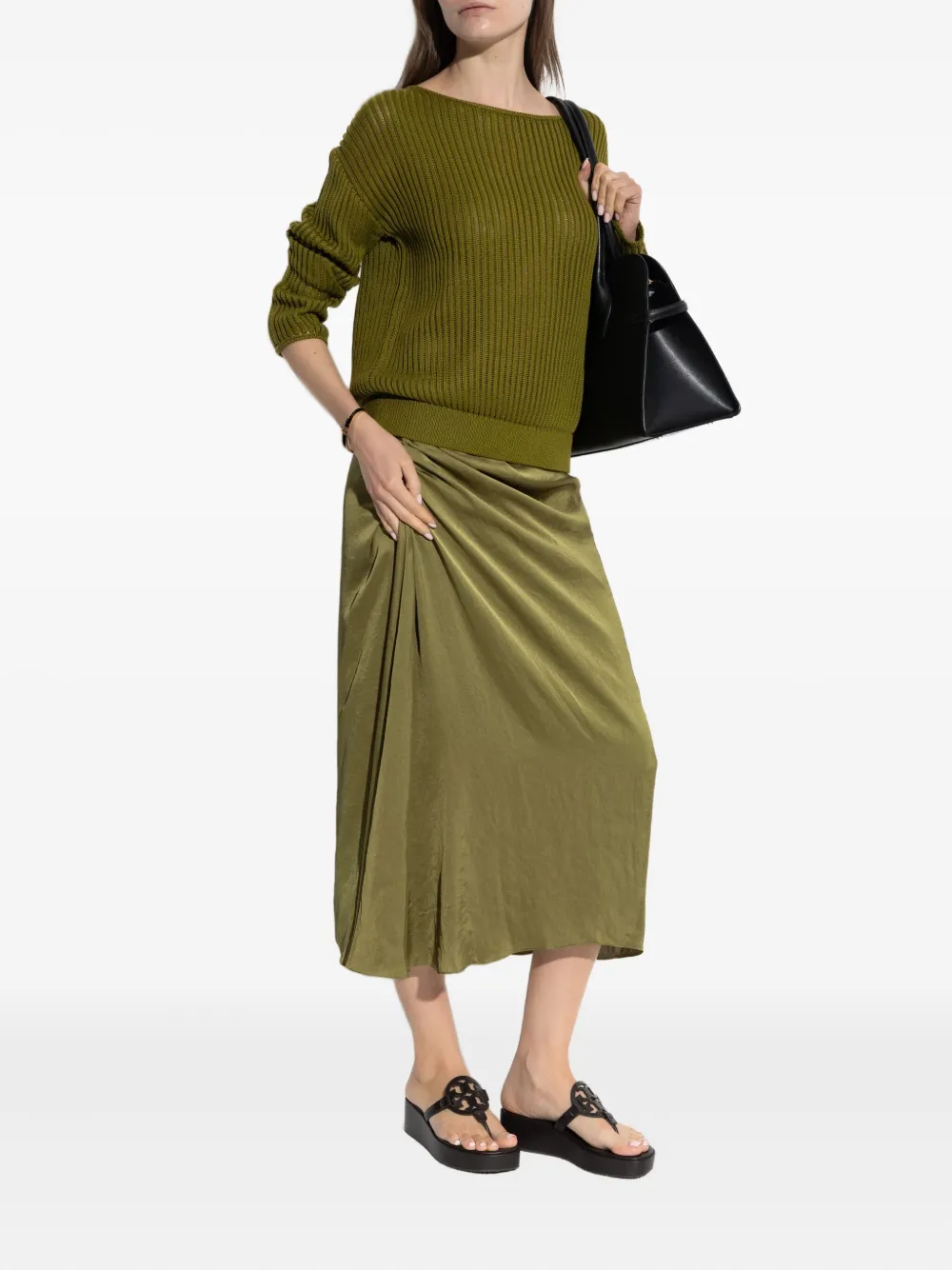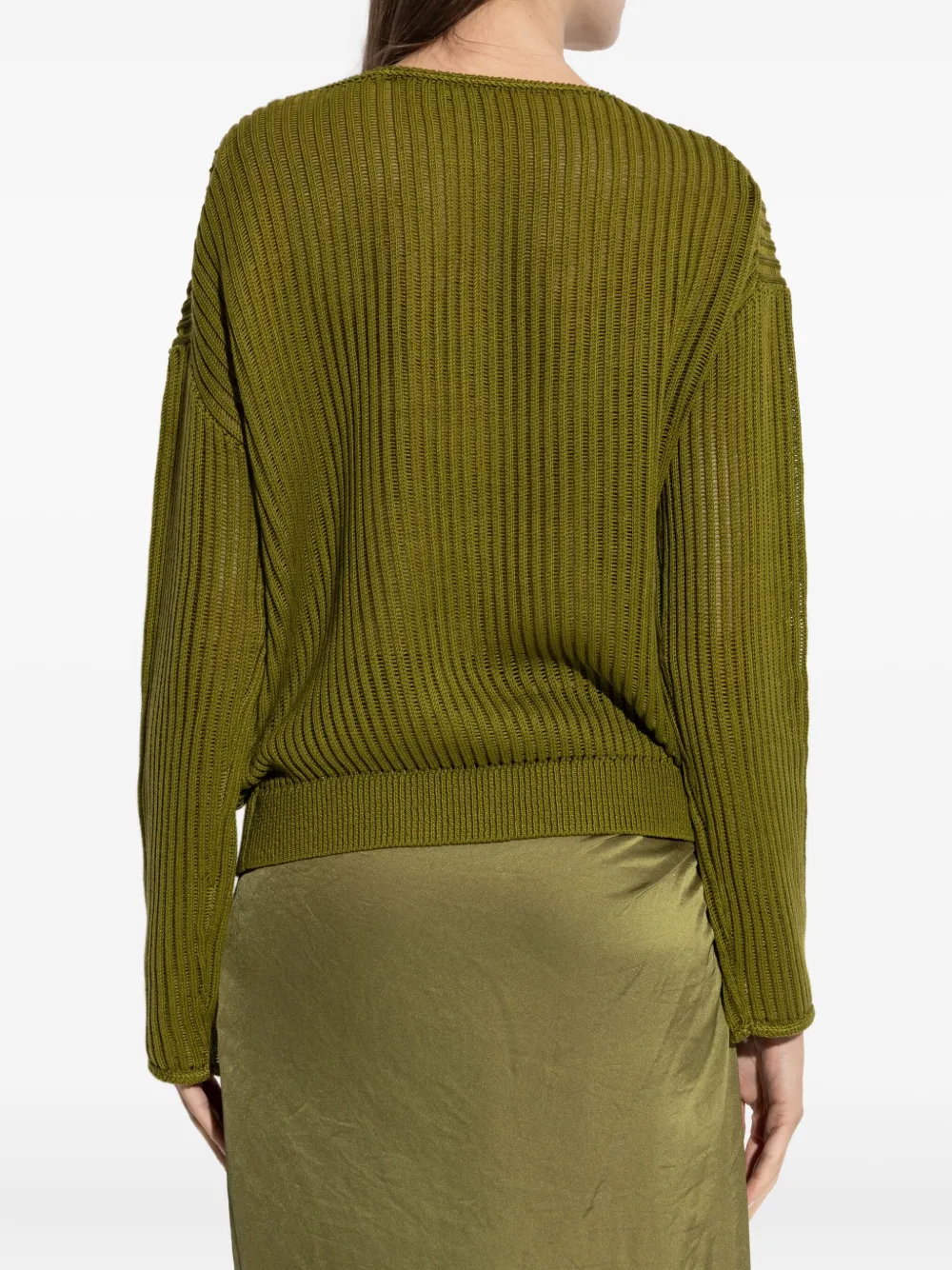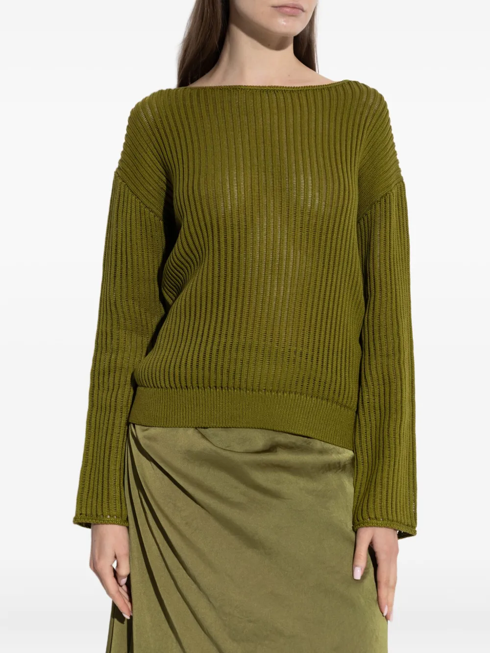 Оливково-зеленый пима-хлопок, трикотаж в рубчик, вырез лодочкой, длинные рукава