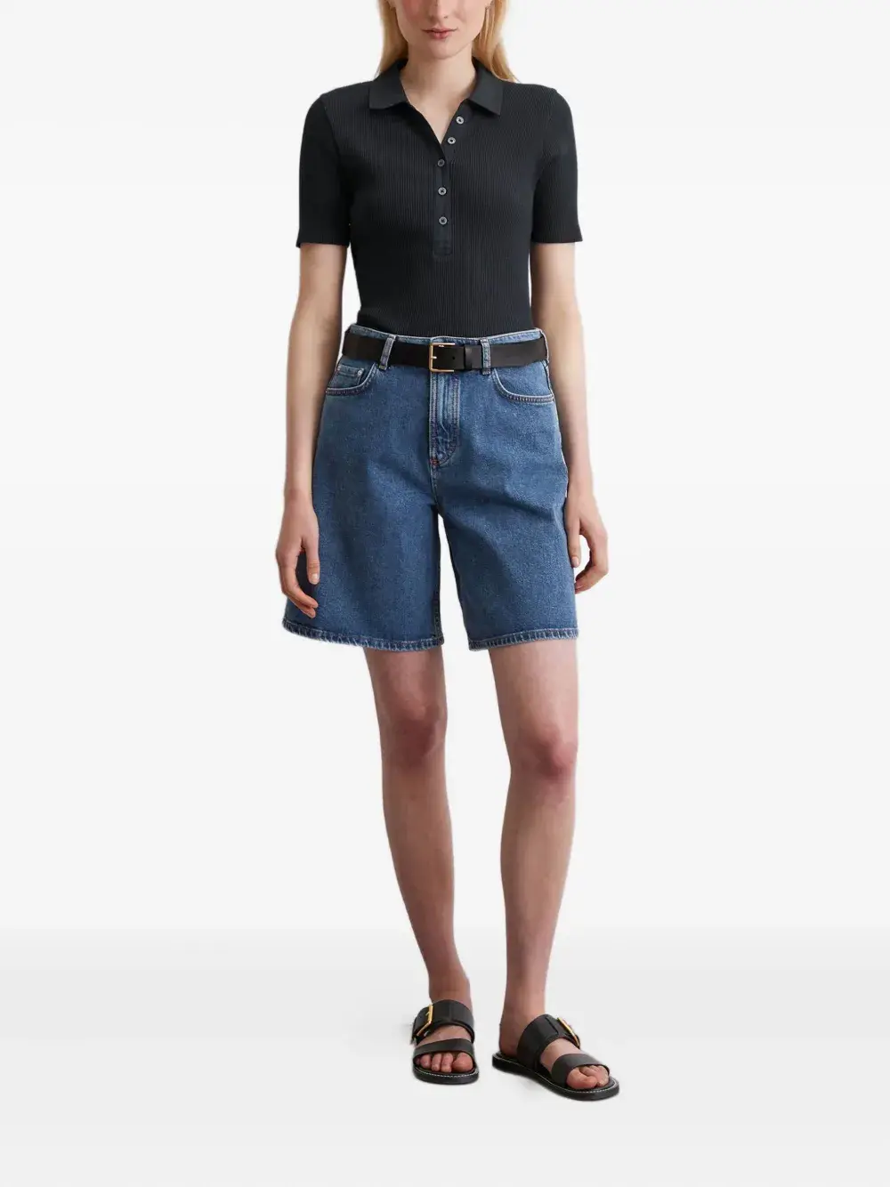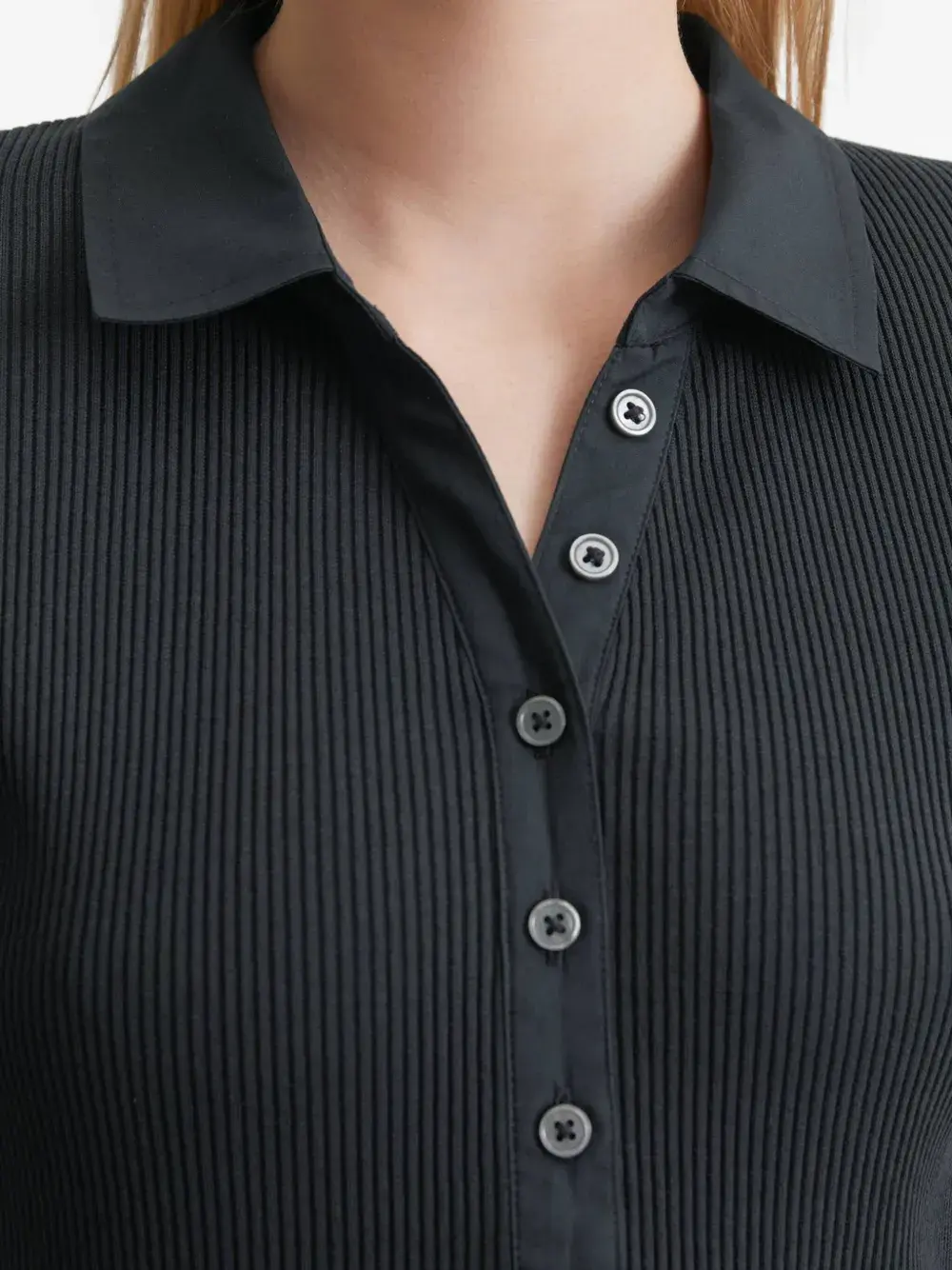 Черный воротник-поло, короткие рукава, застежка на пуговицы, ребристая текстура.