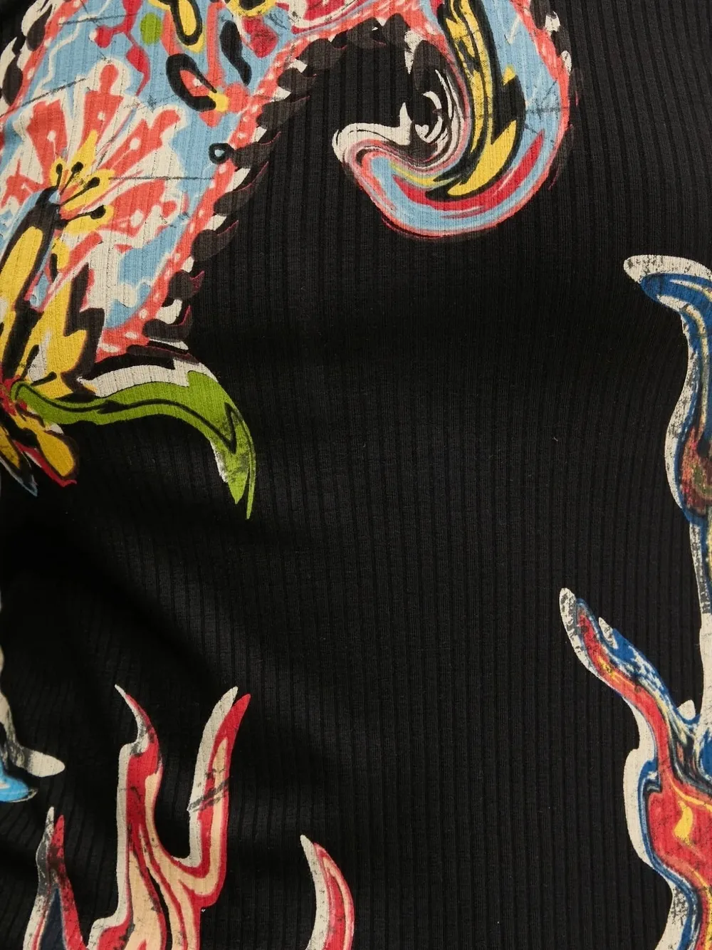 Черная ребристая ткань с длинными рукавами, абстрактным принтом, длина миди