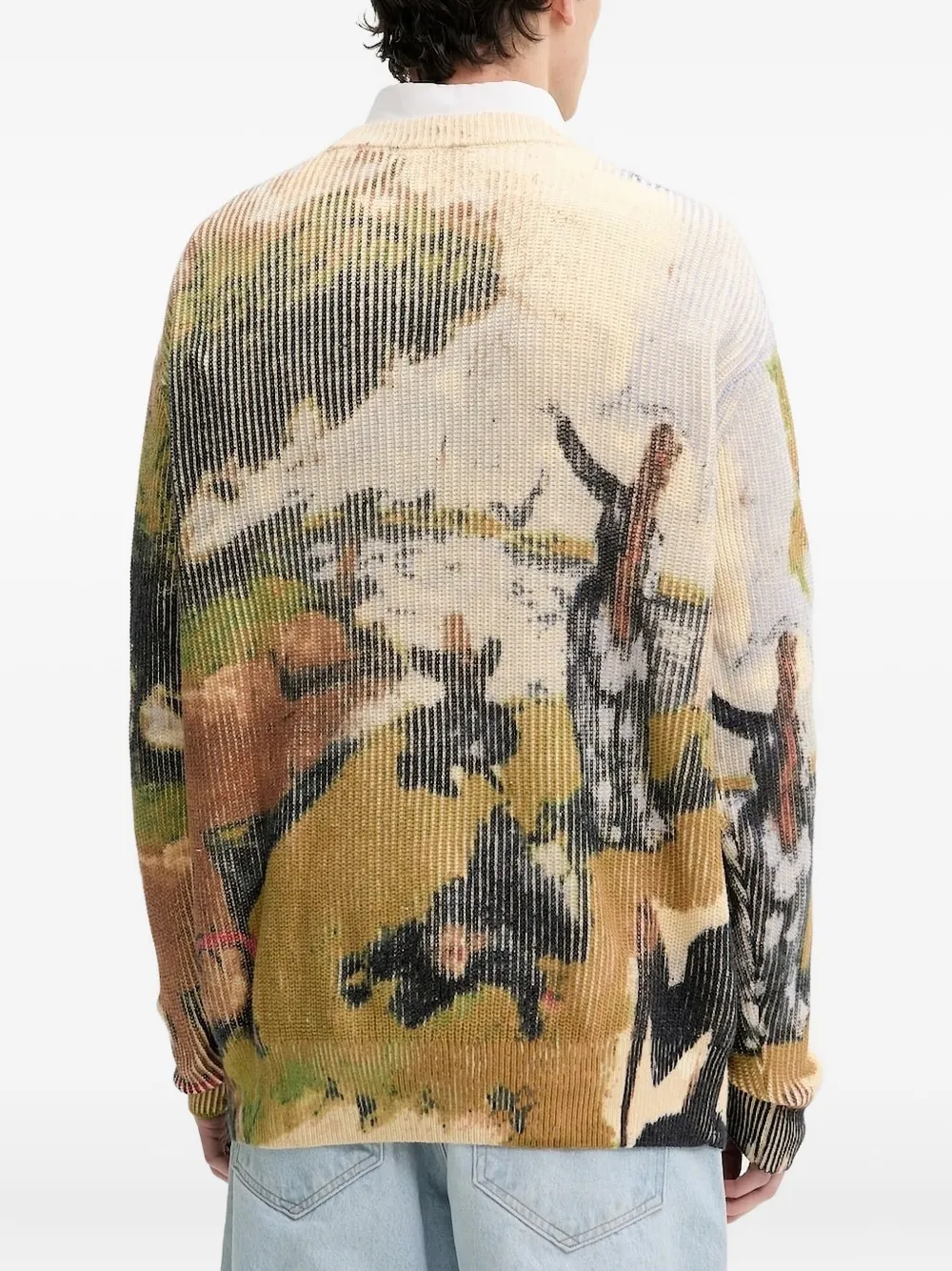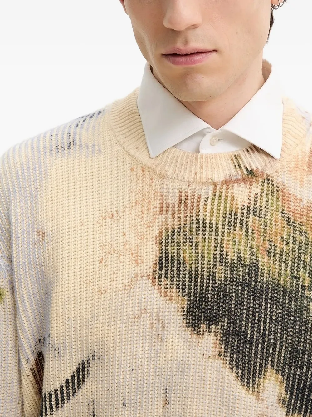 Бежевый пейзажный принт, ребристая фактура, круглый вырез, длинные рукава