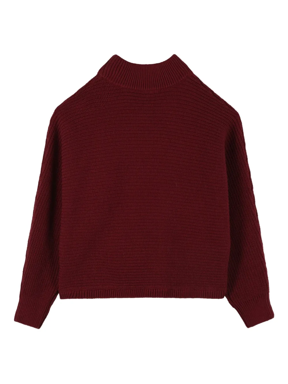 Длинные рукава бордового цвета, отделка резинкой, отложной воротник, свободный крой по подолу.