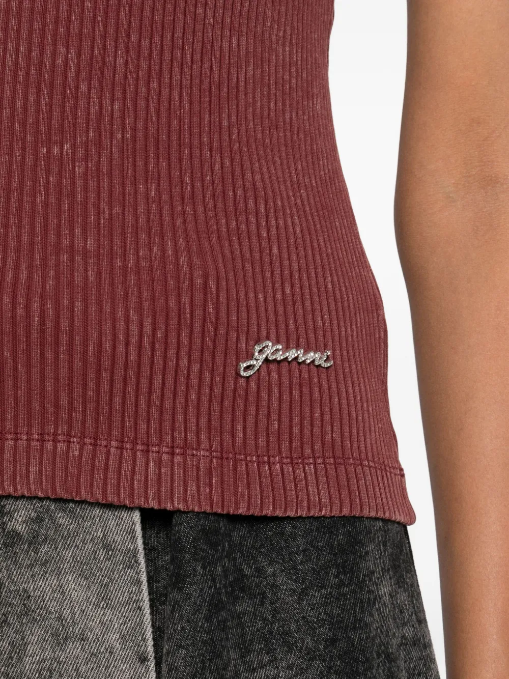 Темно-красный органический хлопок, ребристая фактура, без рукавов, круглый вырез, логотип на бляшке