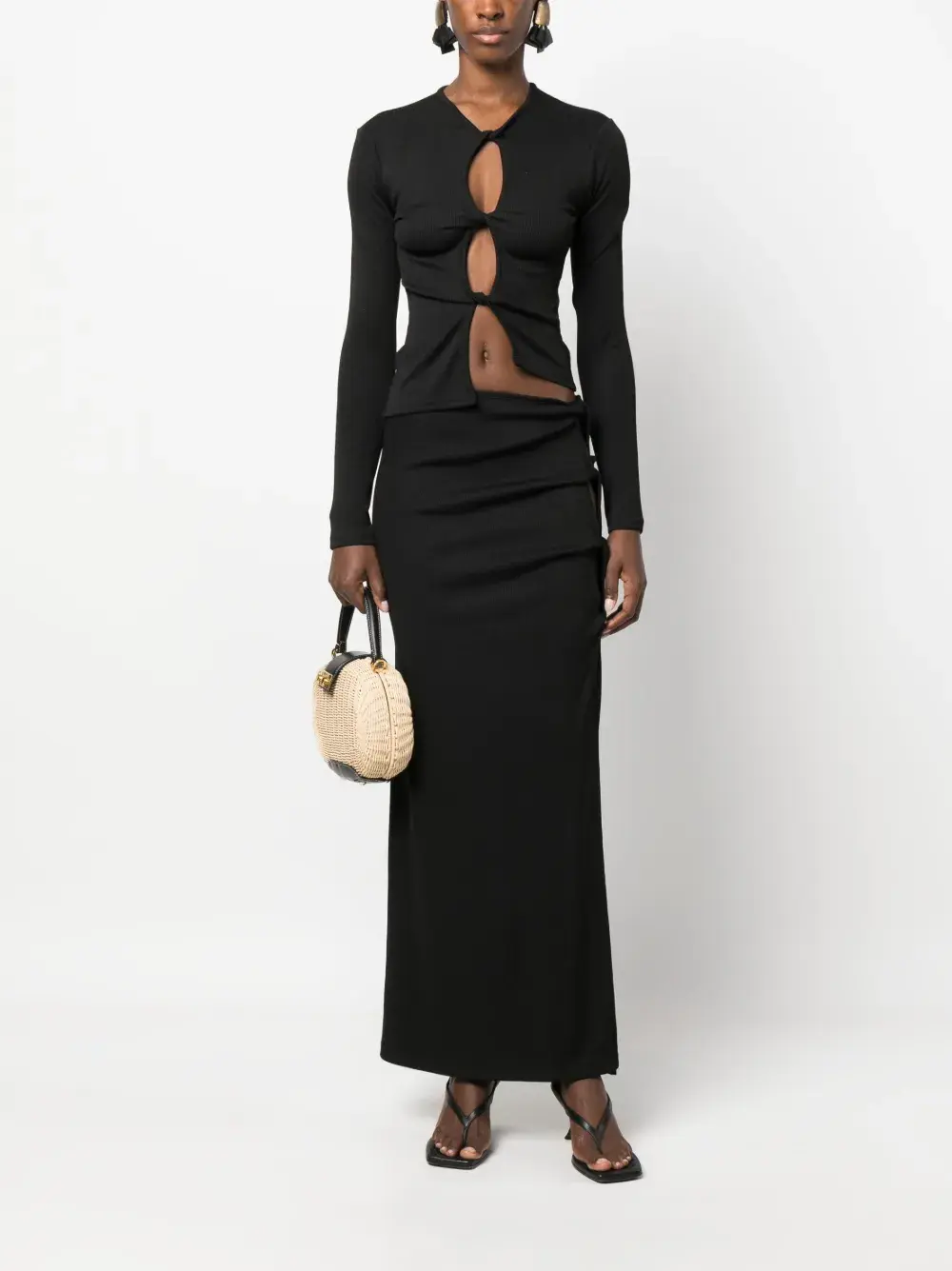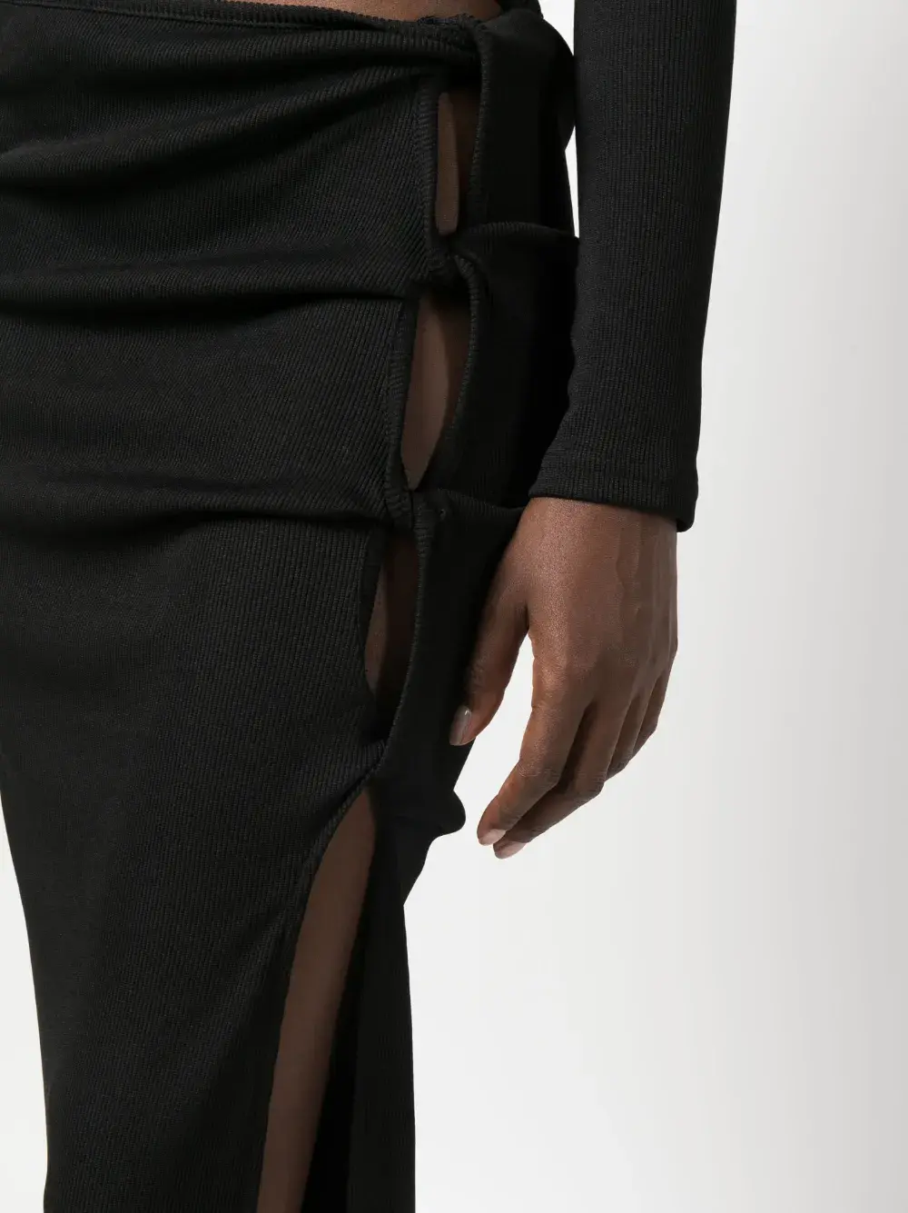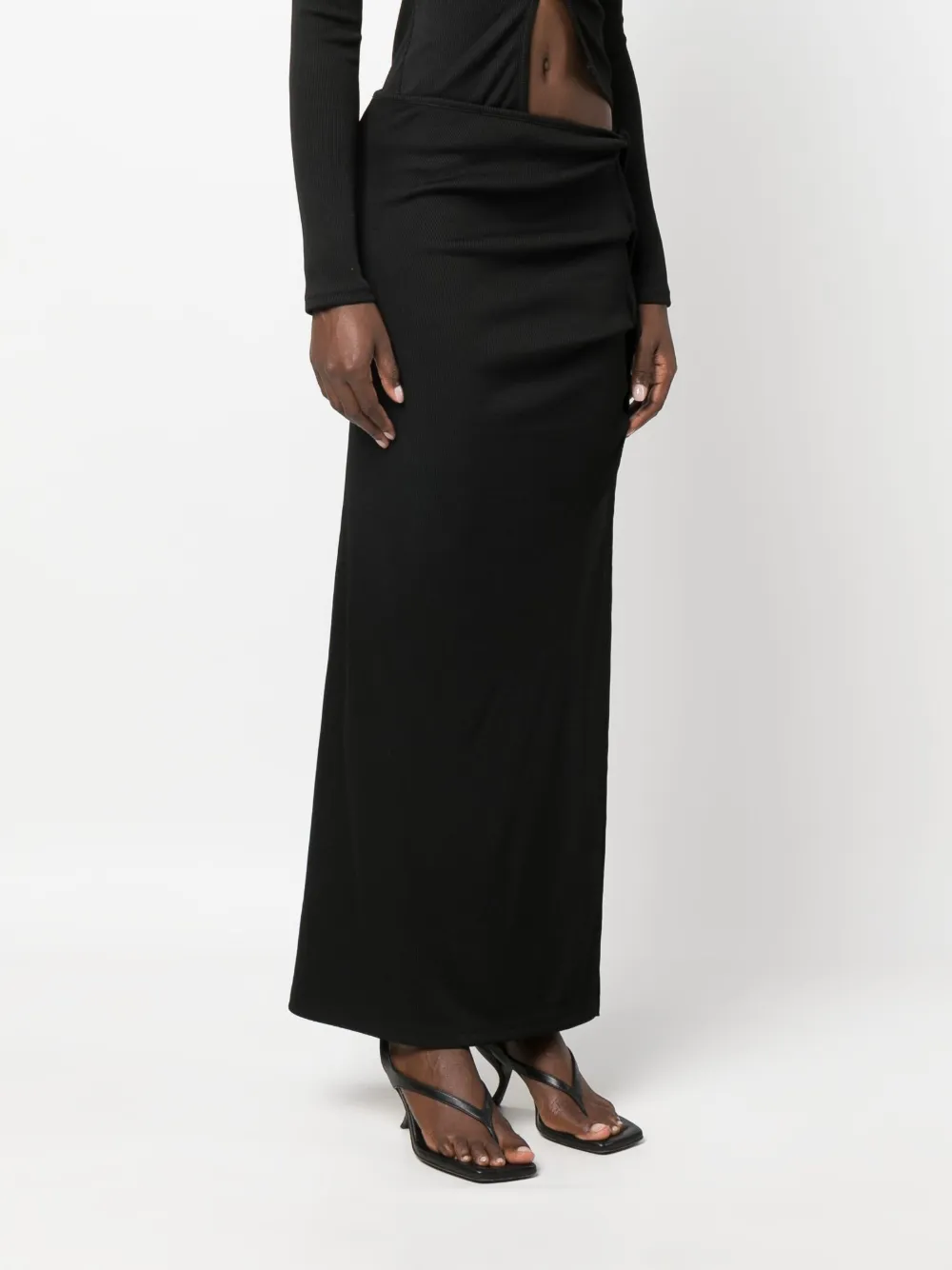Черный, ткань в мелкий рубчик, перекрученная деталь, эластичный пояс, завышенная линия талии, боковой разрез, длинная модель и прямой подол.