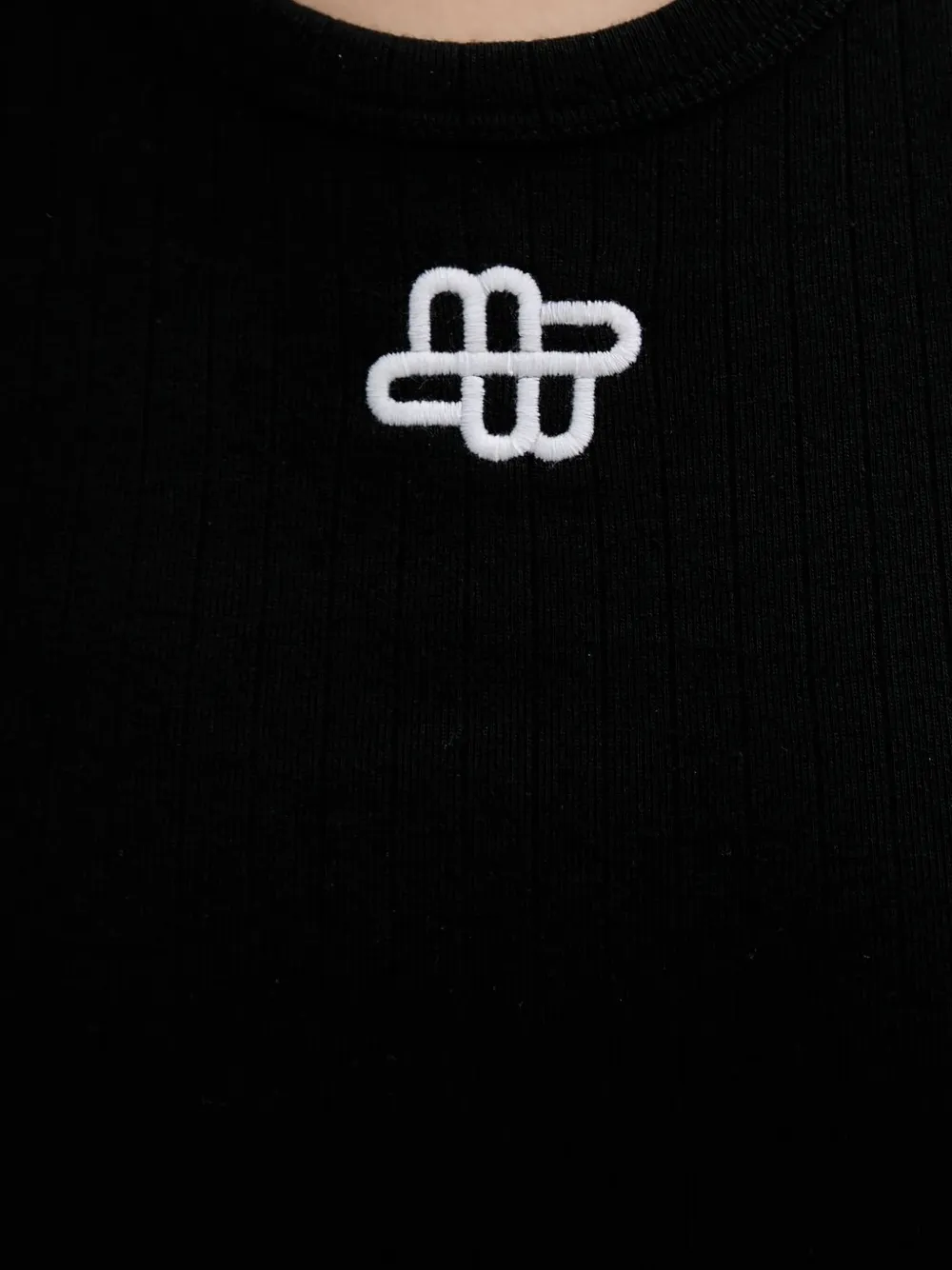 Черная рубчатая ткань, без рукавов, длина макси, круглый вырез, вышитый логотип
