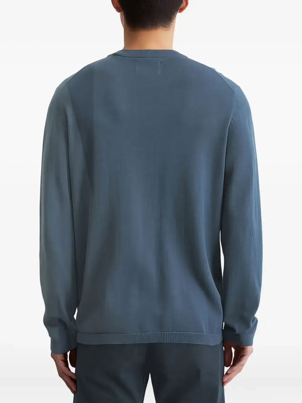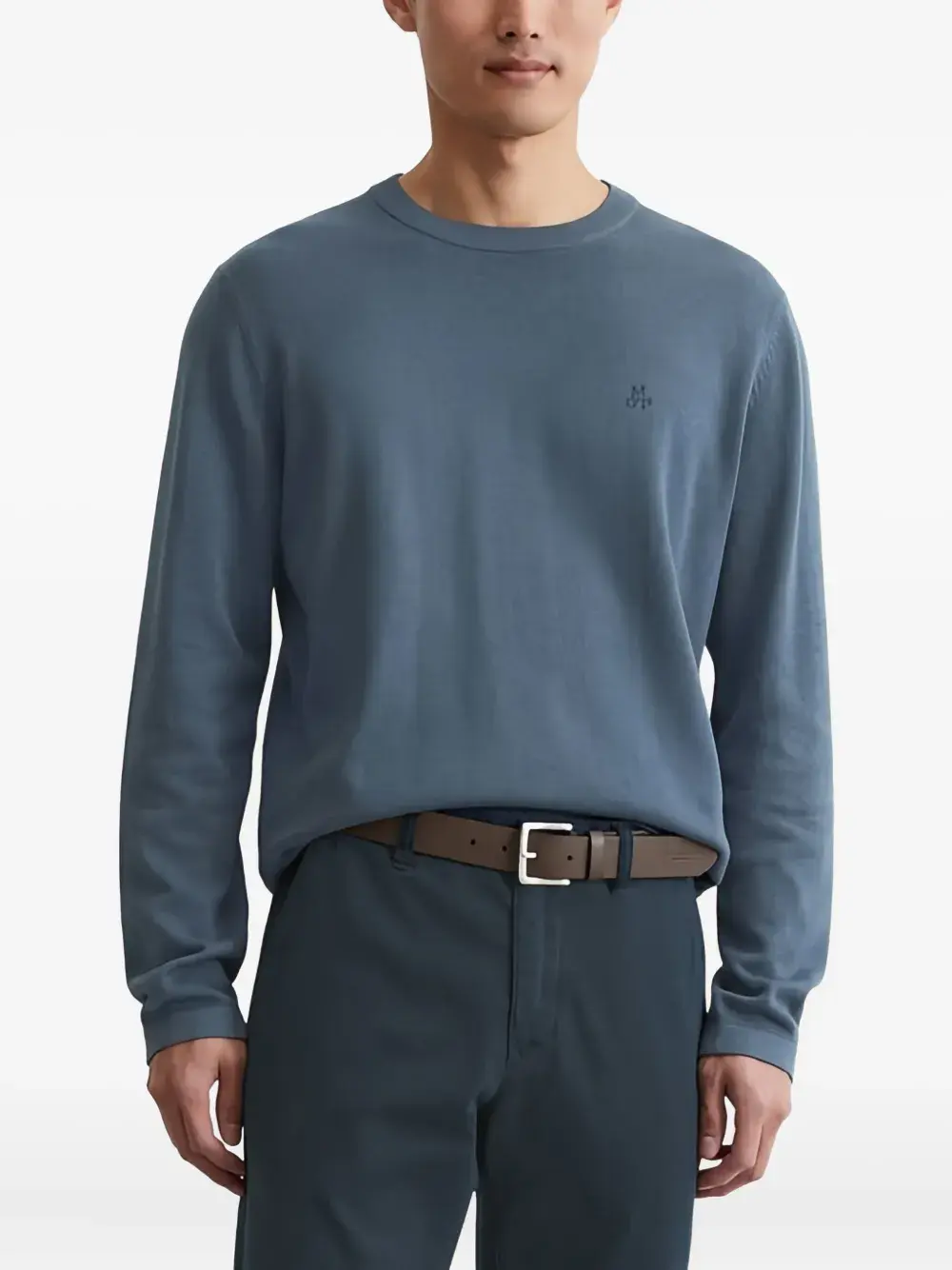 Синяя хлопково-кашемировая смесь, длинные рукава, круглый вырез горловины, вышитый логотип.