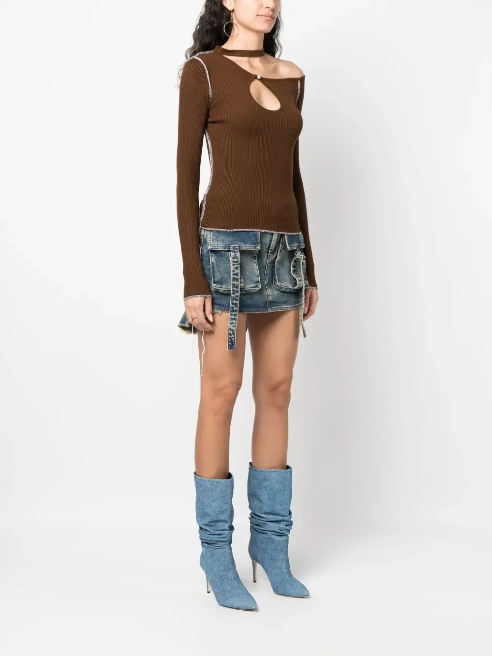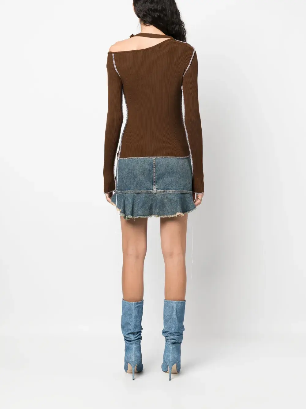 Каштановый, трикотаж в рубчик, вырезные детали, открытые плечи, декоративные швы, длинные рукава, узкий крой и прямой подол.