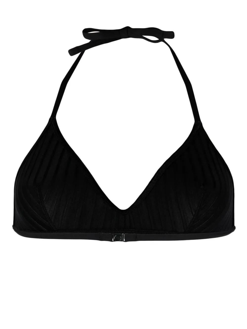 Черный, детали в рубчик, треугольная чашка, завязки вокруг шеи и застежка на зажиме сзади. Пожалуйста, примеряйте купальники и пляжные шорты только поверх собственного белья.