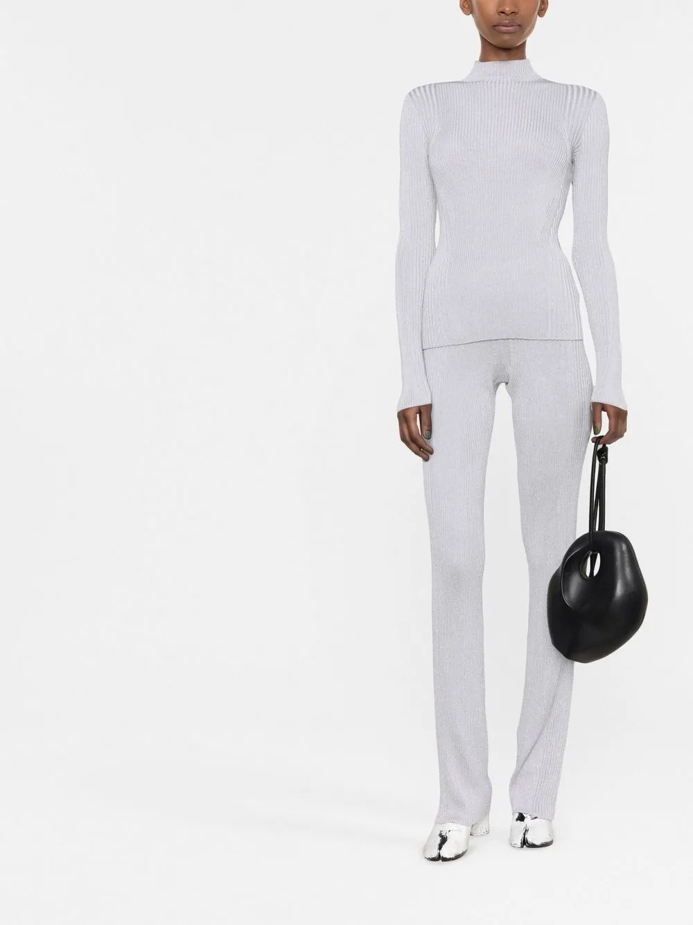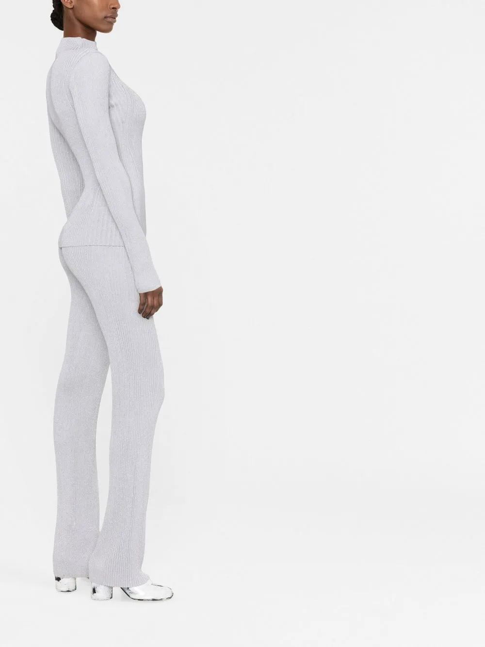 Серебро, трикотаж в рубчик, модель без застежки и расклешенный крой.