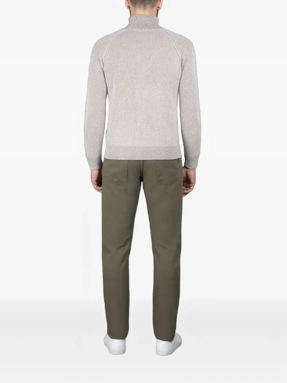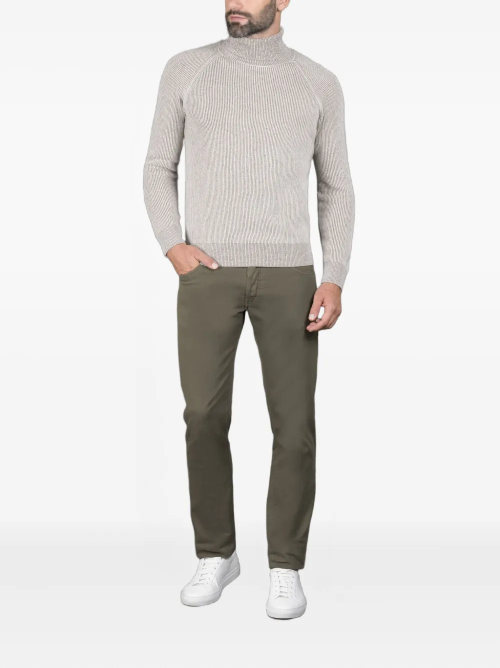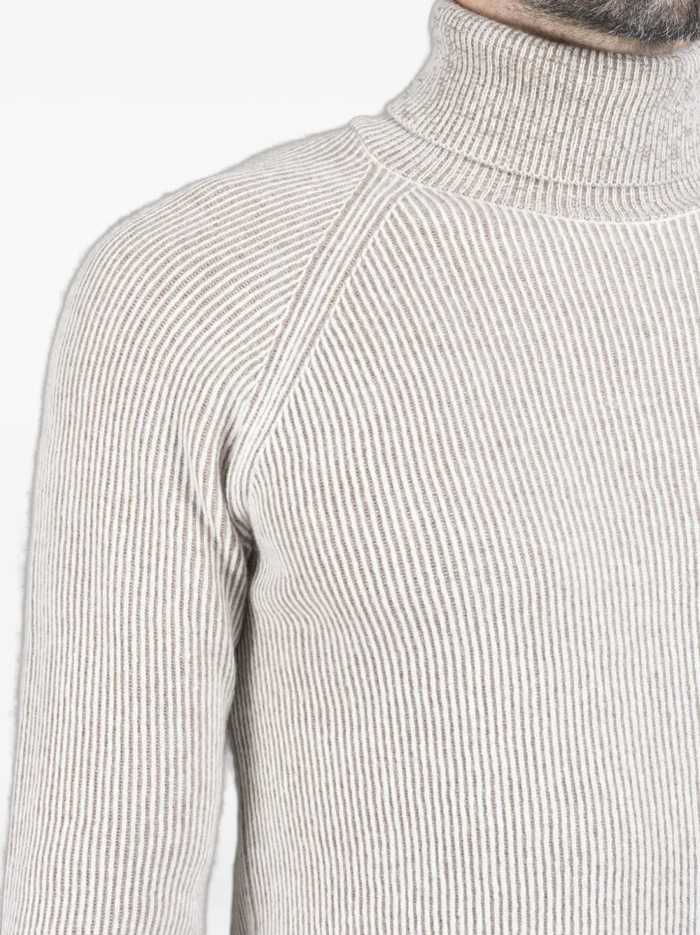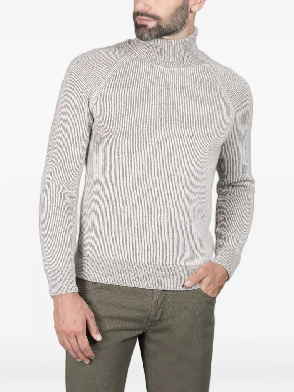 Серая водолазка с ребристым трикотажем, рукава реглан, прямой подол, длинные рукава.