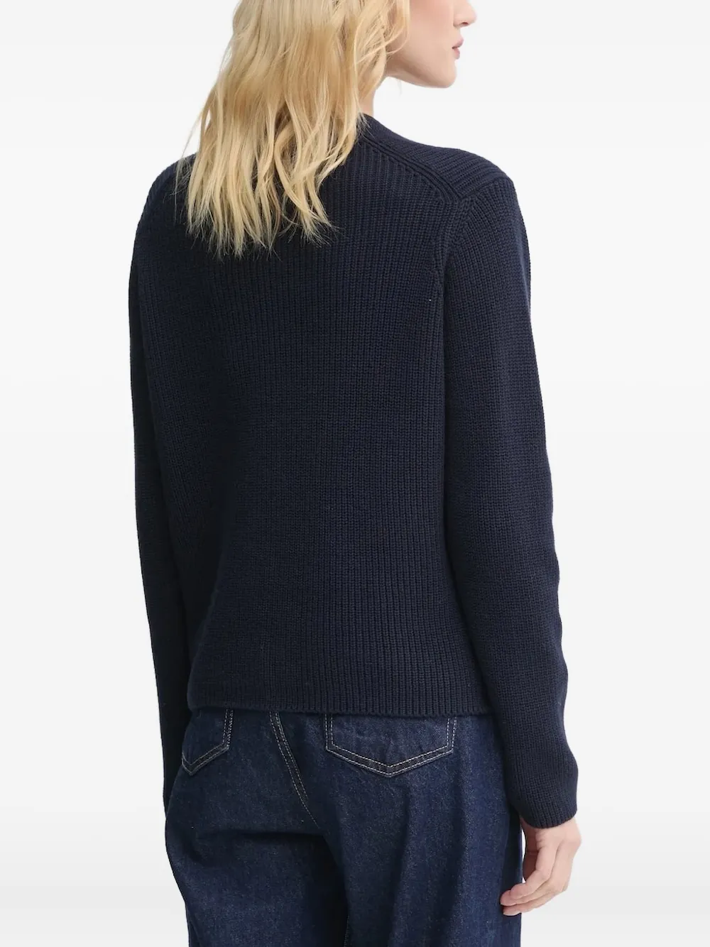 Темно-синий V-образный вырез, застежка на пуговицы, ребристая фактура, длинные рукава.