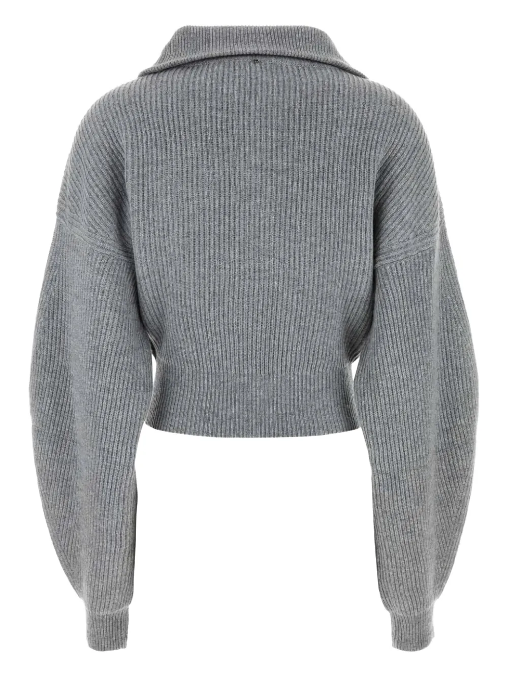 Серый трикотаж с ребристым узором, застежка-молния, воротник-стойка, длинные рукава, рукава-фонарики
