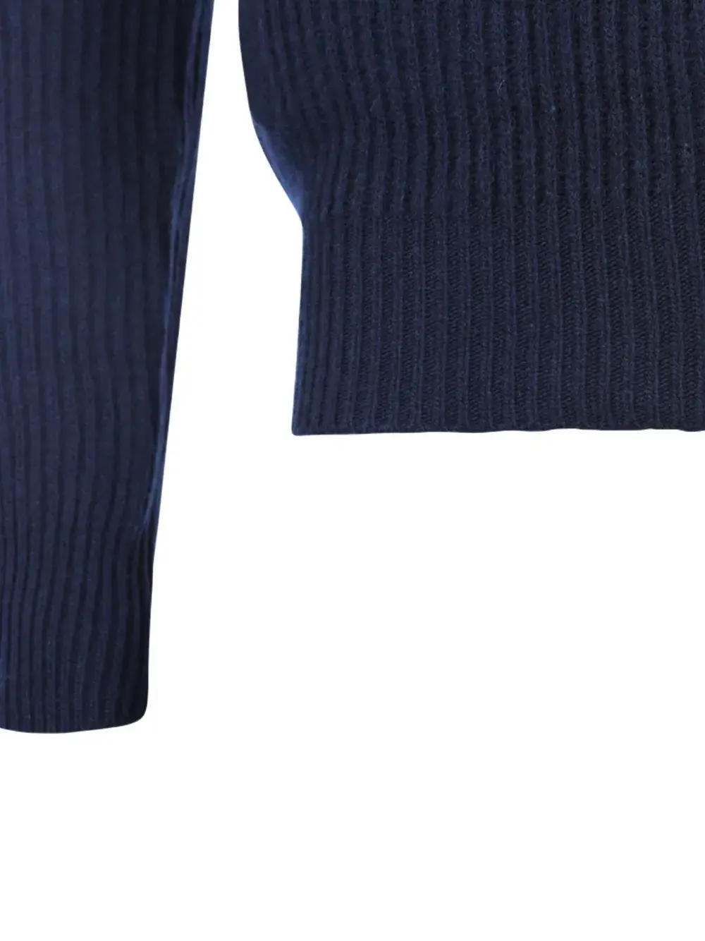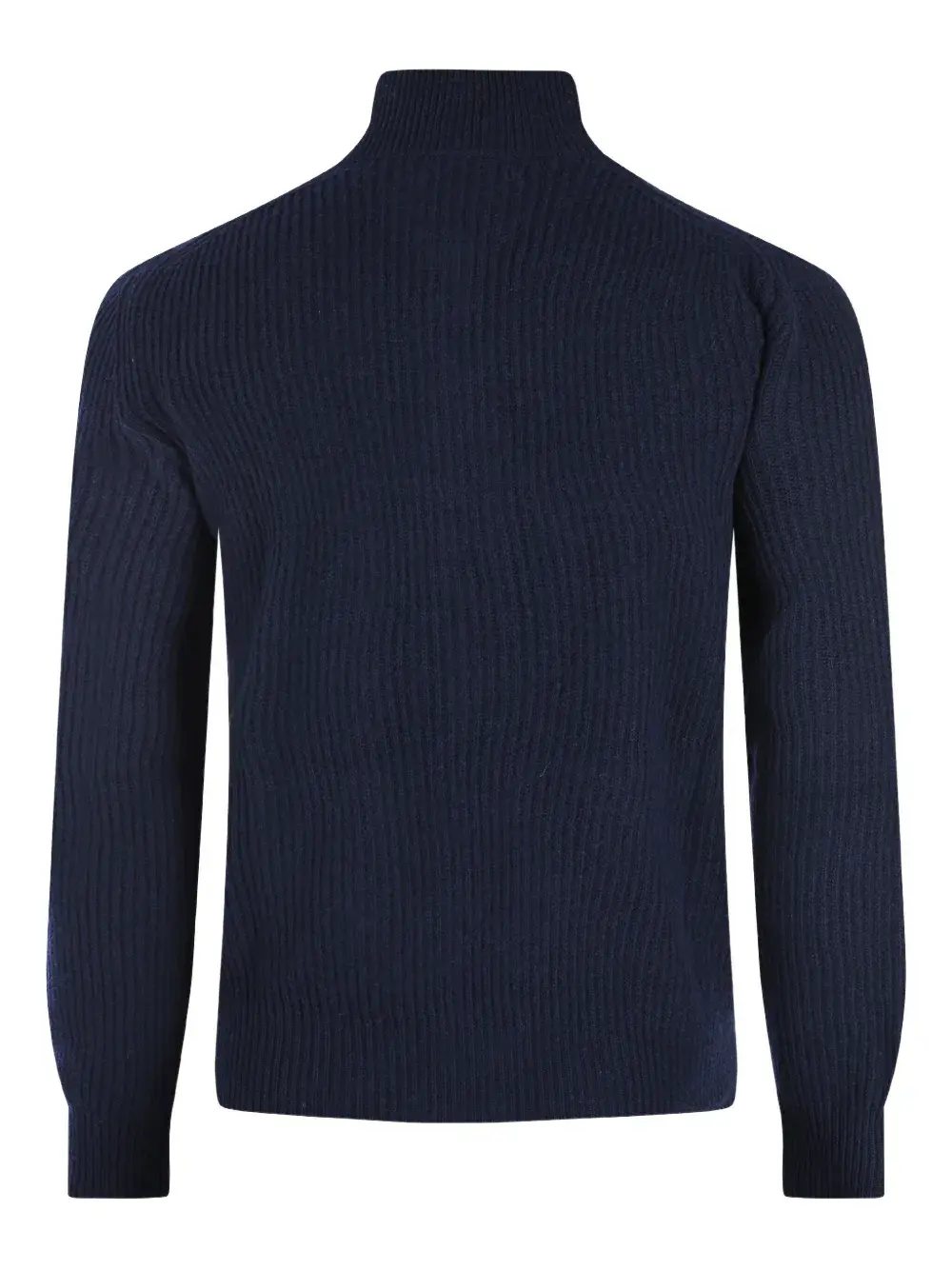 Темно-синяя ребристая трикотажная кофта с застежкой-молнией, высоким воротом и длинными рукавами.