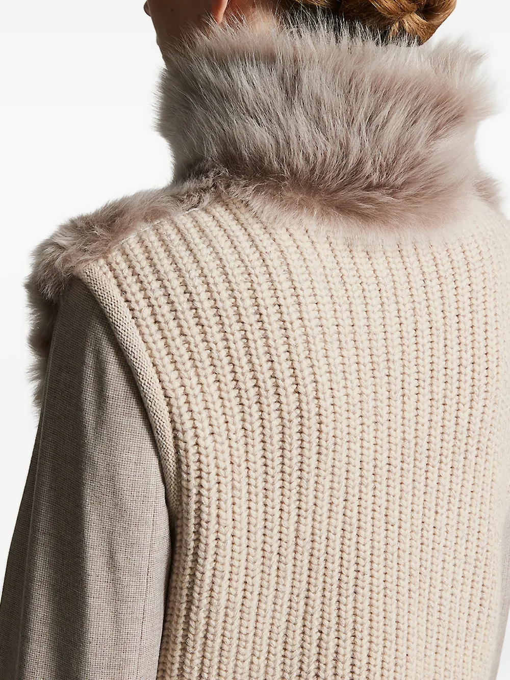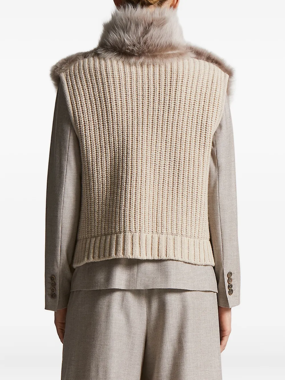 Бежевый ребристой вязки с высоким воротом, без рукавов, застежка-молния