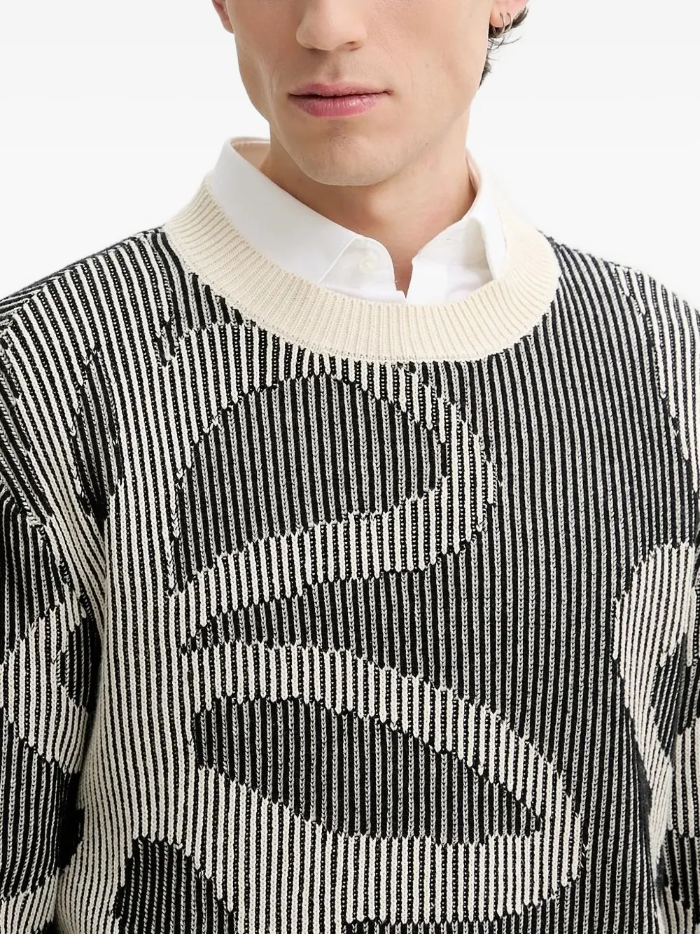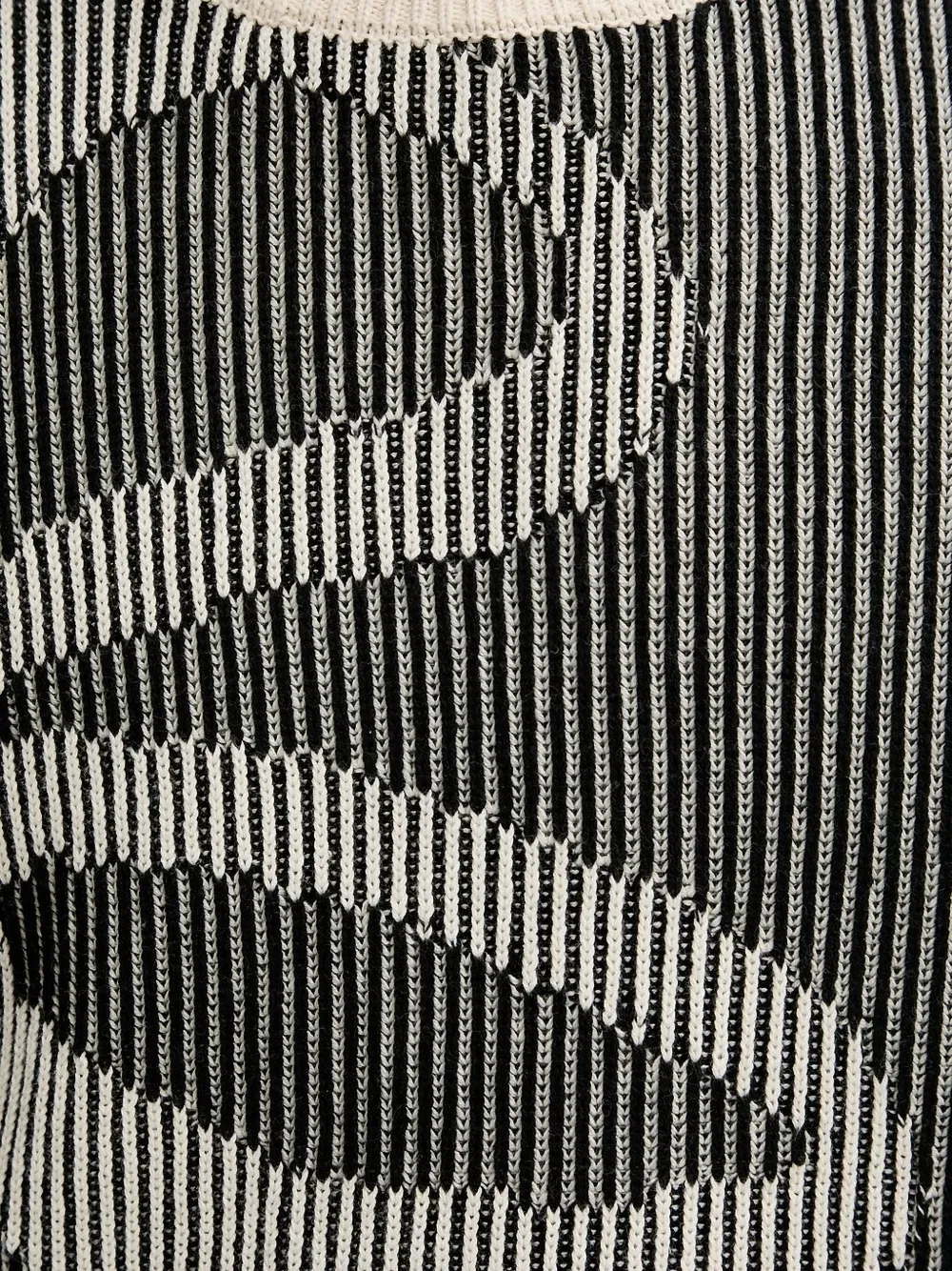 Черный трикотаж в рубчик с абстрактным узором, круглый вырез горловины, длинные рукава, ребристый подол, ребристые манжеты.