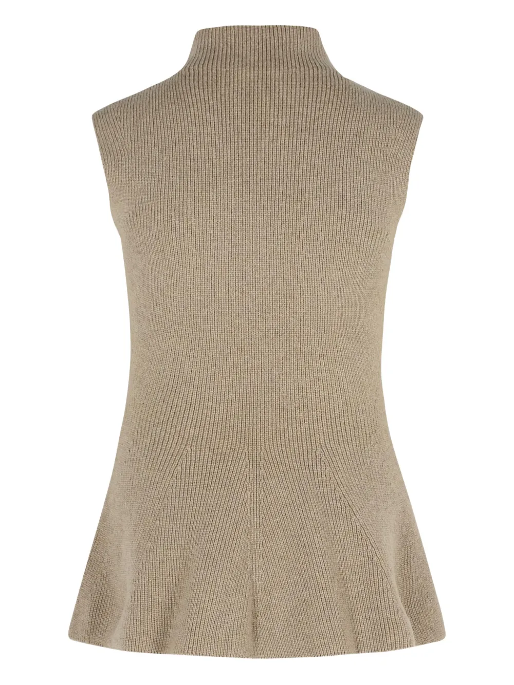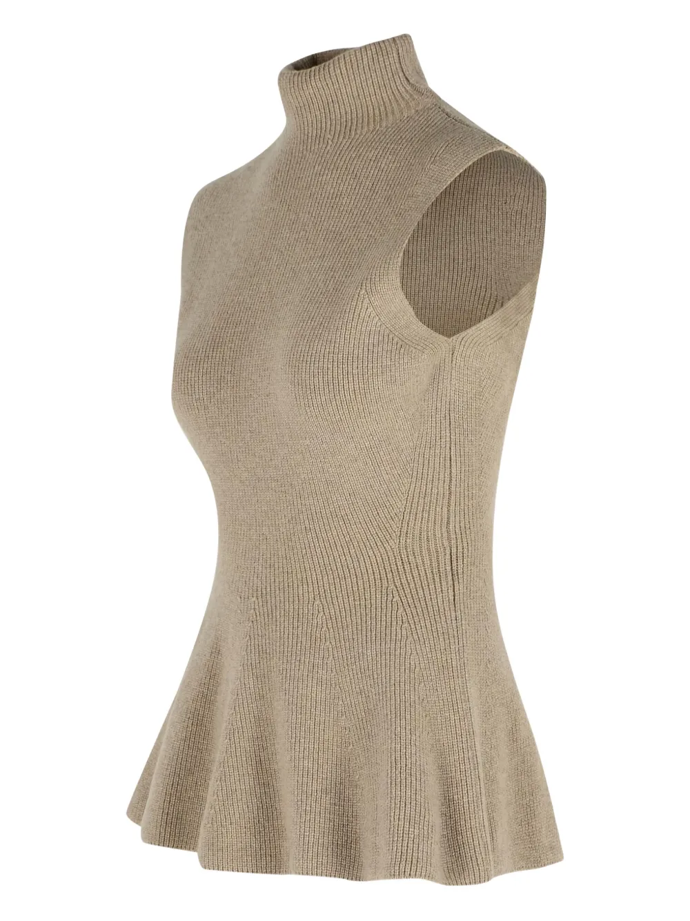 Бежевый ребристой вязки без рукавов с высоким воротом