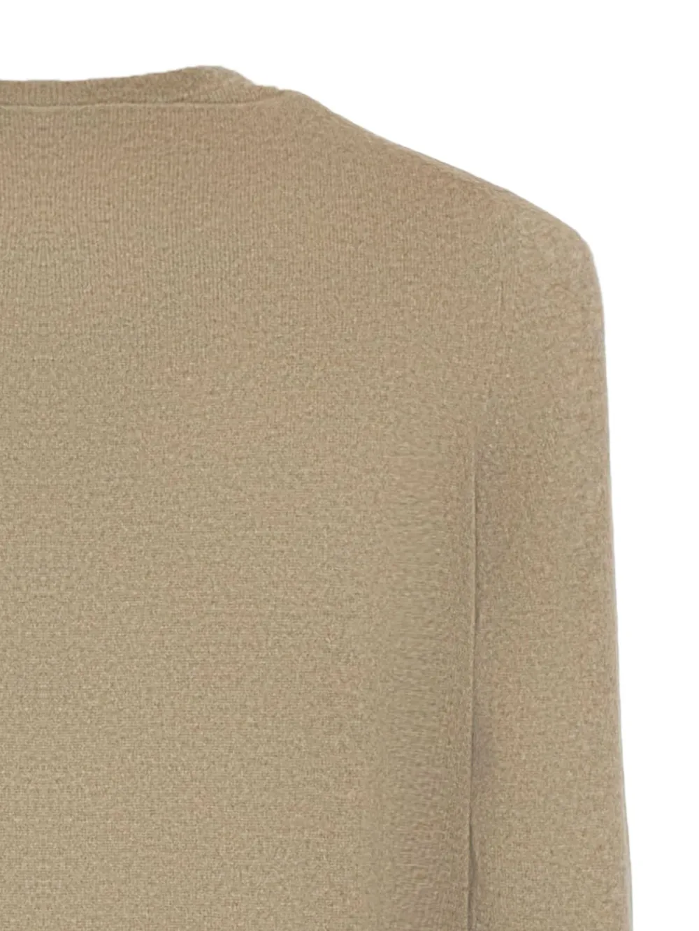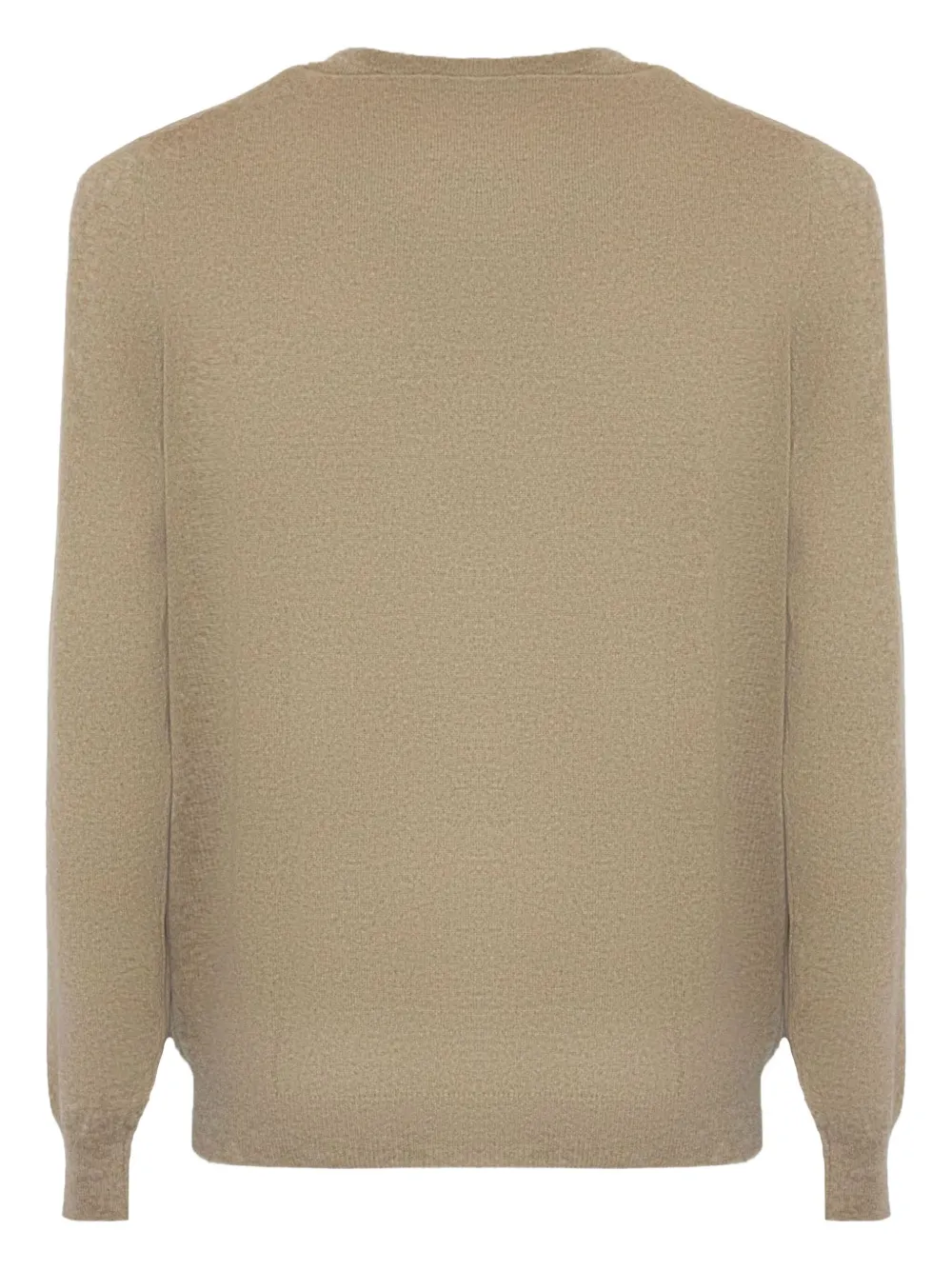 Пепельно-бежевый кашемир с круглым вырезом, длинными рукавами, ребристыми отделками.