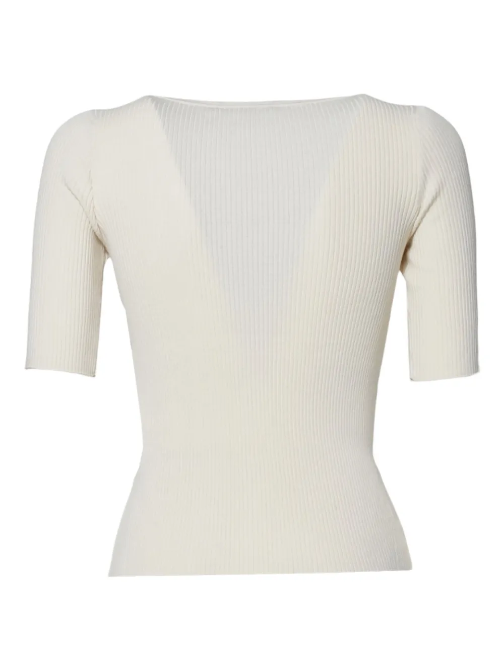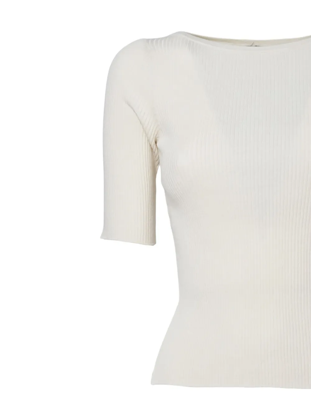 Белый трикотаж в рубчик, круглый вырез горловины, рукава три четверти, прямой подол.