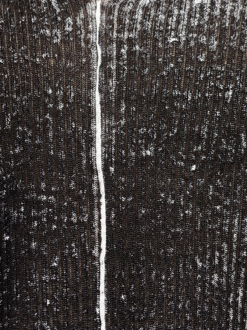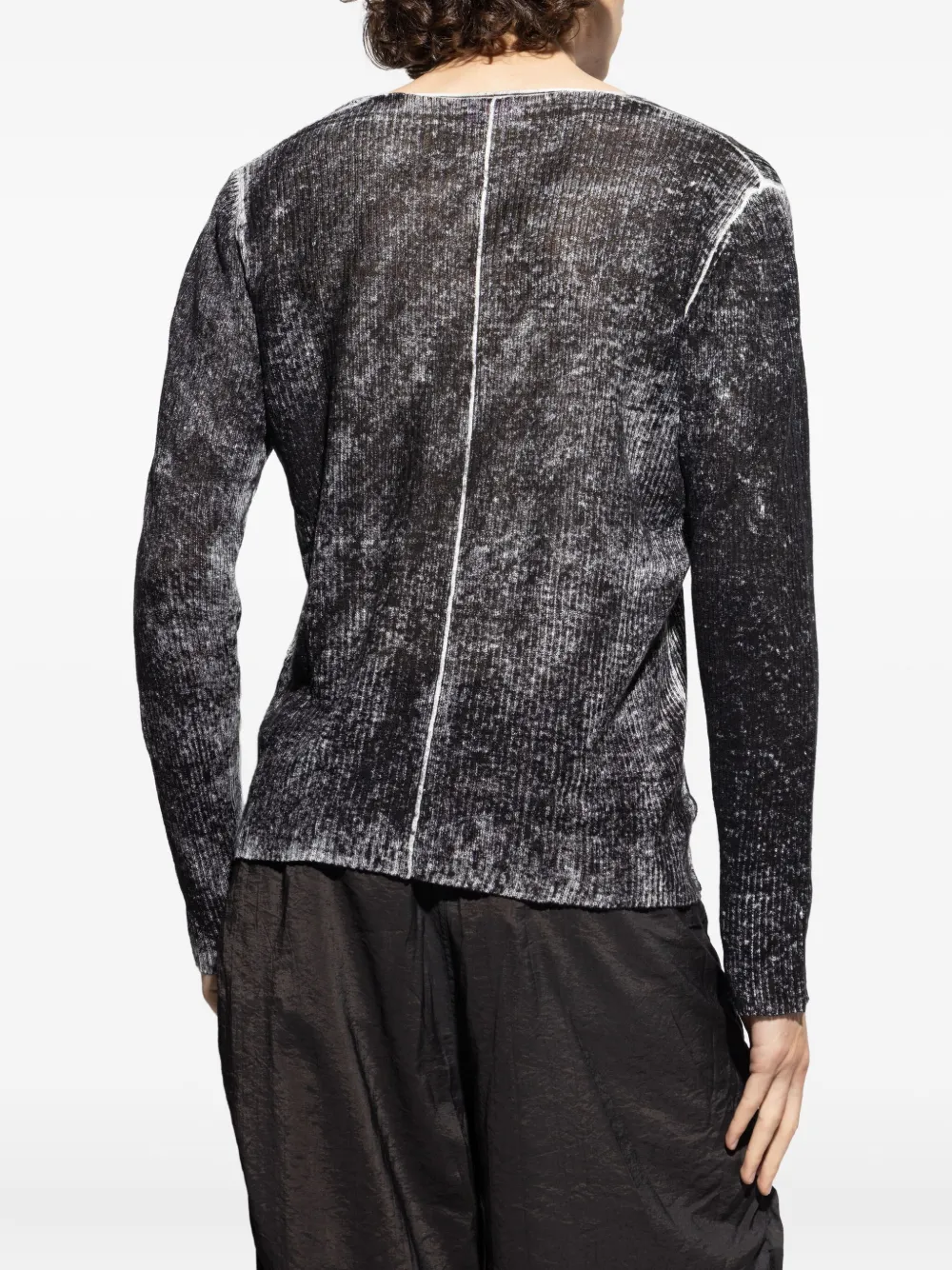 Черный трикотаж в рубчик, V-образный вырез, длинные рукава, центральный шов, эффект потертости