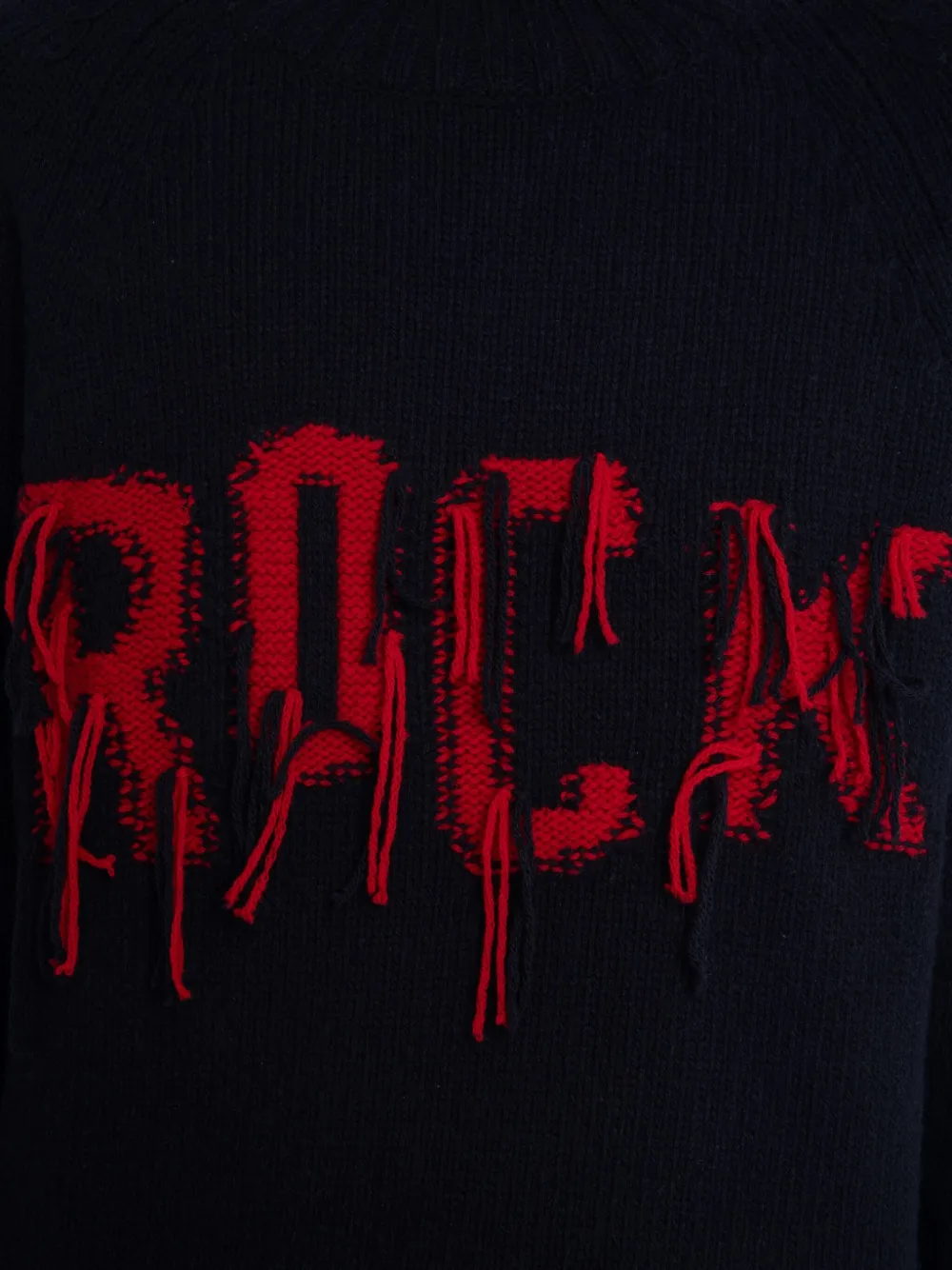 Черная водолазка с длинными рукавами, ребристым подолом, необработанными надписями, шерстяной трикотаж.