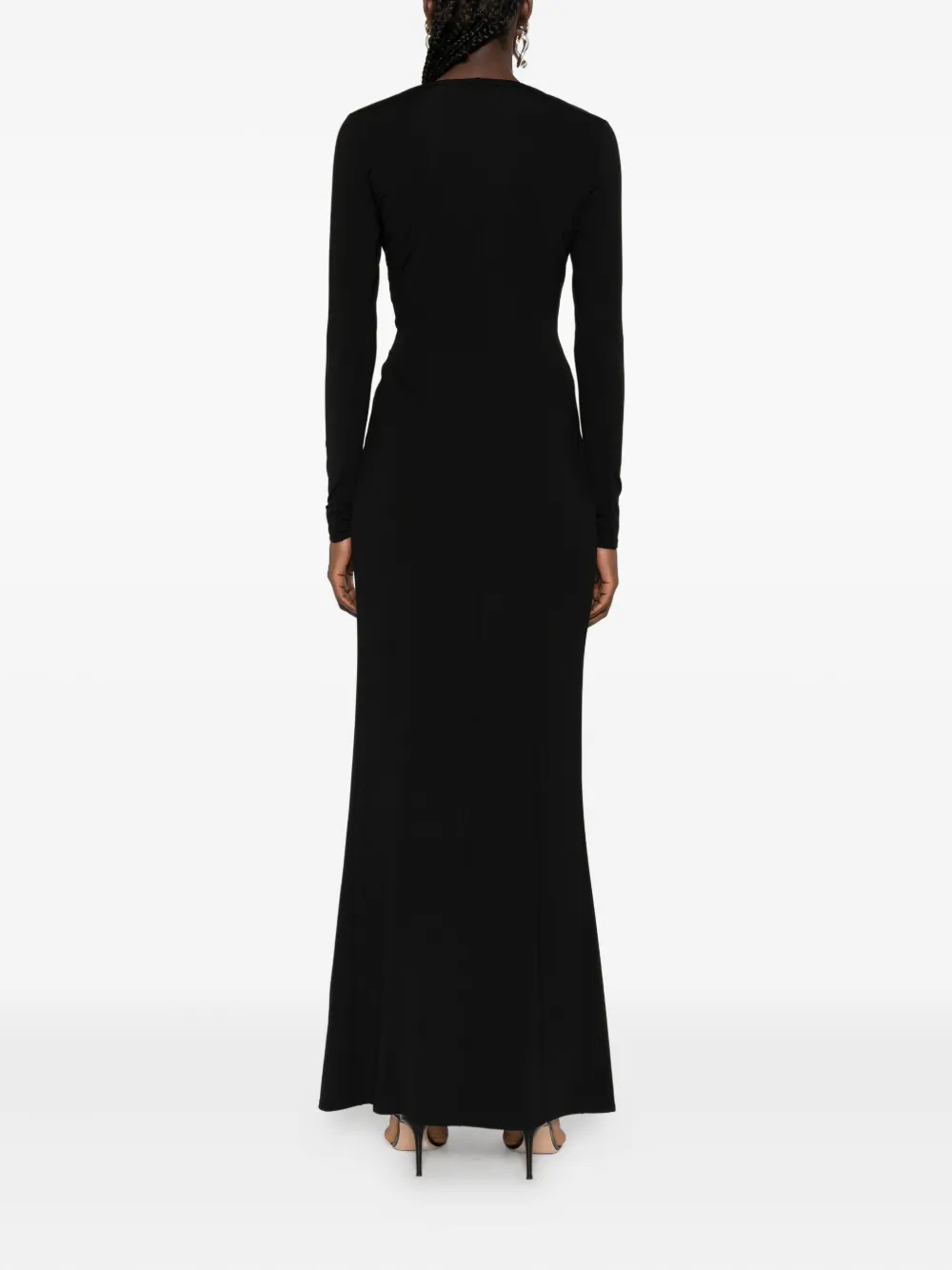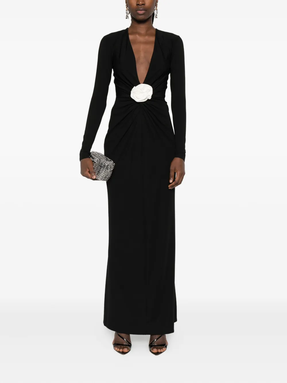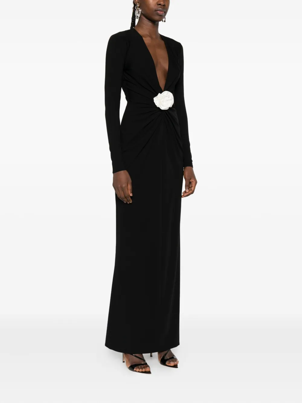Черное платье с длинными рукавами, розовым декором, длиной до пола.